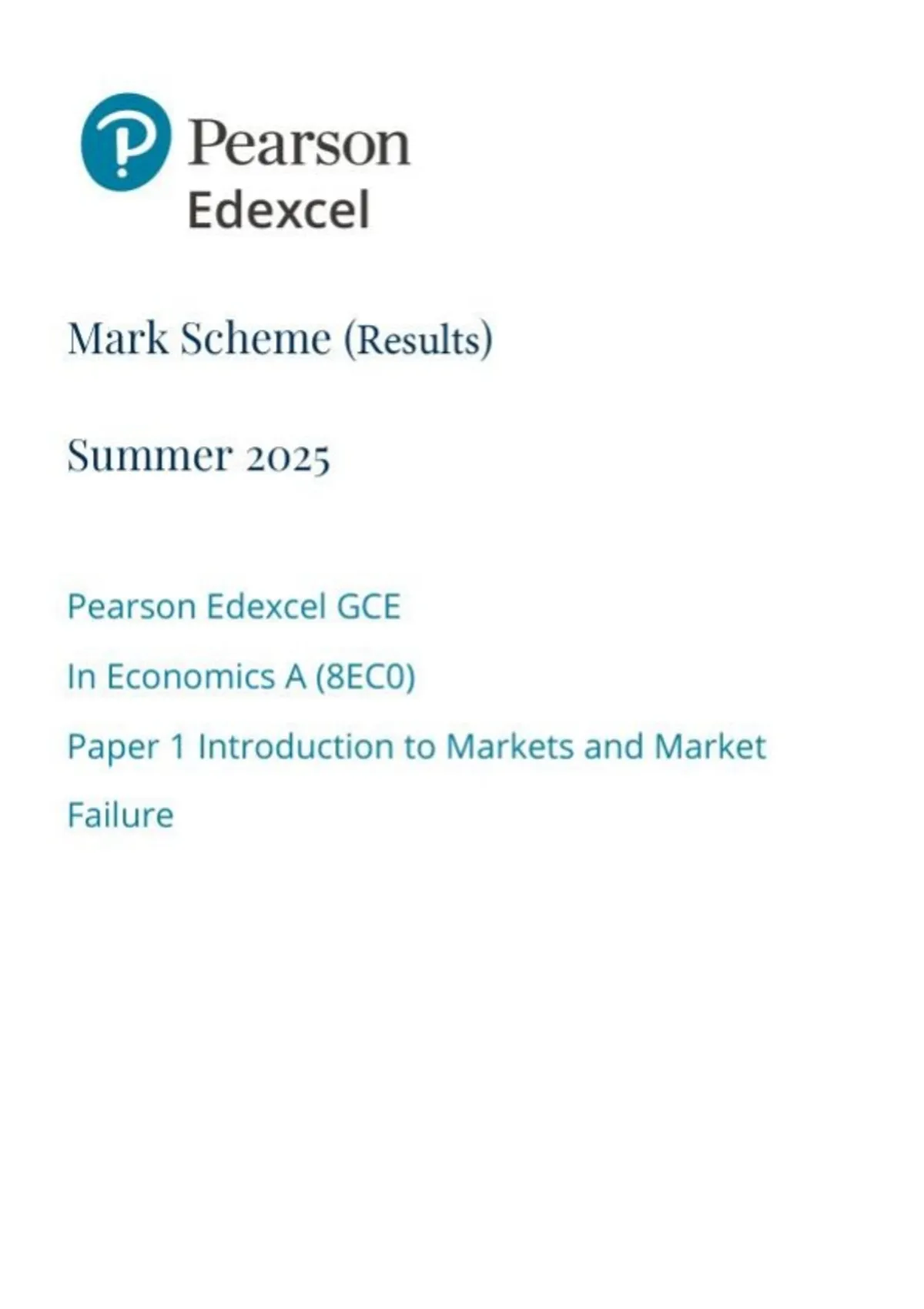 Pearson Edexcel GCE In Economics A (8ЕСО) Paper 1 Introduction to Markets and Market Failure mark scheme June 2025