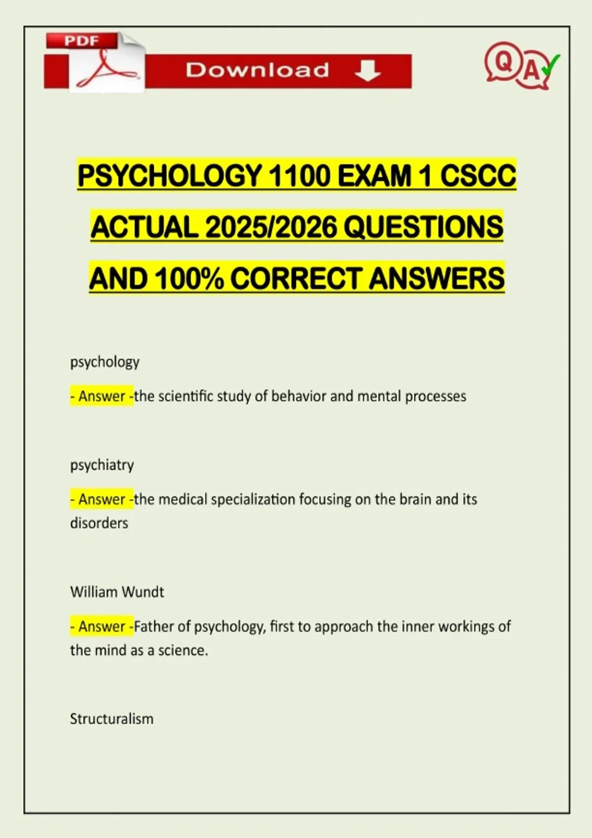 PSYCHOLOGY 1100 EXAM 1 CSCC ACTUAL 2025/2026 QUESTIONS AND 100% CORRECT ANSWERS psychology - Answer -the scientific study of behavior and mental processes psychiatry - Answer -the medical specialization focusing on the brain and its disorders William Wundt - Answer -Father of psychology, first to approach the inner workings of the mind as a science. Structuralism