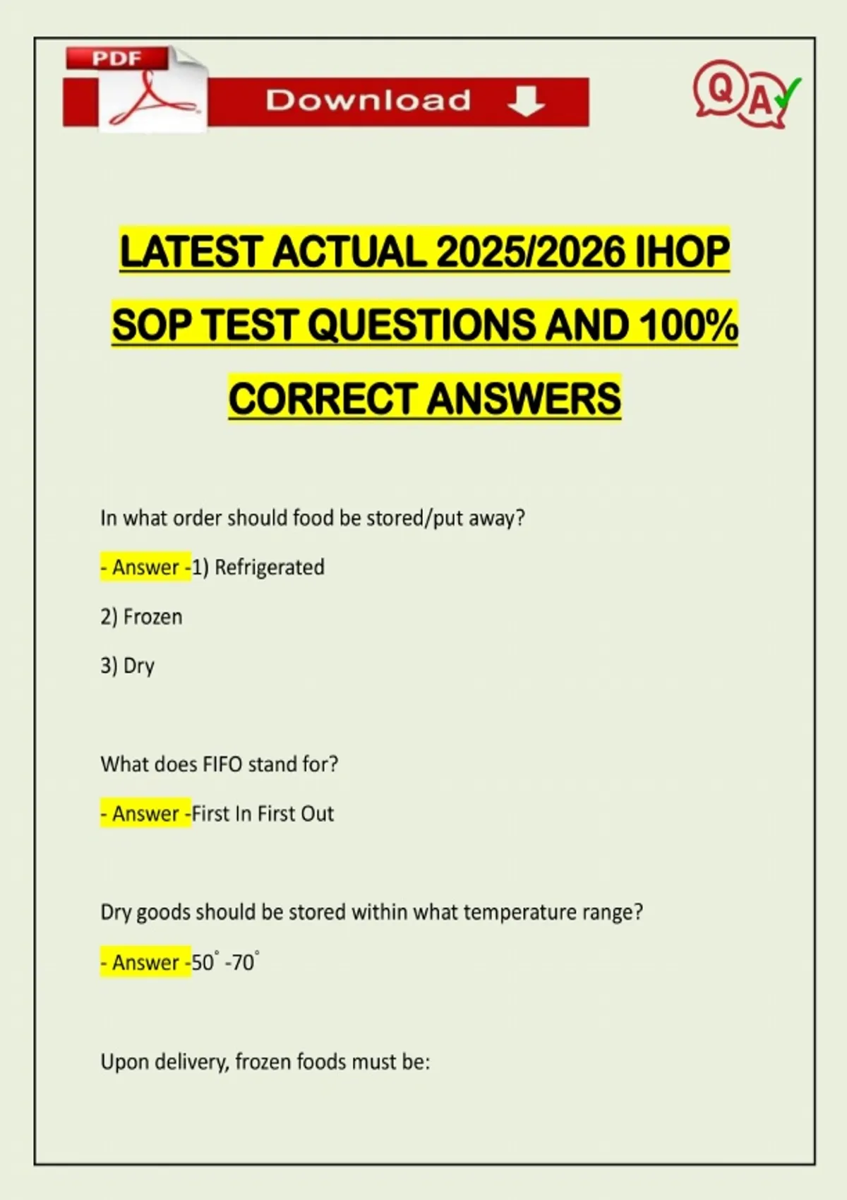 LATEST ACTUAL 2025/2026 IHOP SOP TEST QUESTIONS AND 100% CORRECT ANSWERS In what order should food be stored/put away? - Answer -1) Refrigerated 2) Frozen 3) Dry What does FIFO stand for? - Answer -First In First Out Dry goods should be stored within w