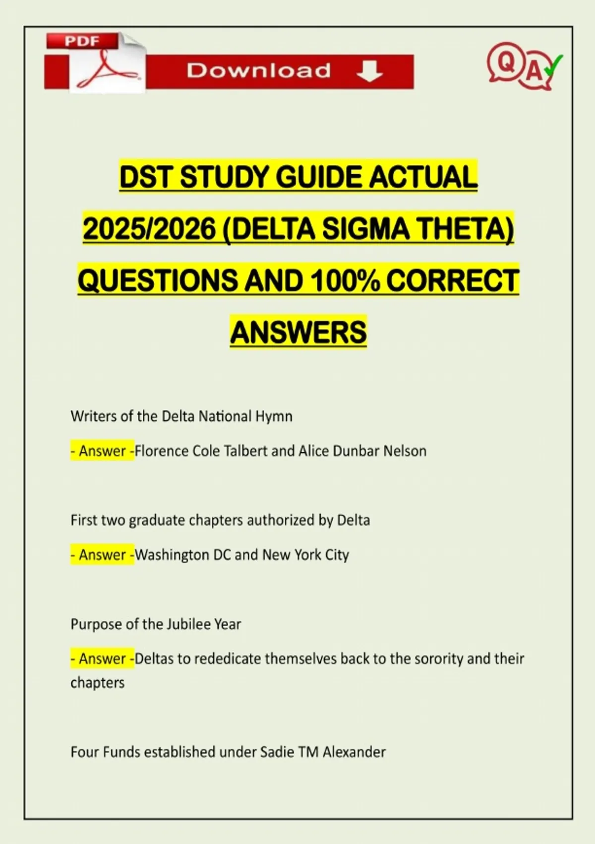 DST STUDY GUIDE ACTUAL 2025/2026 (DELTA SIGMA THETA) QUESTIONS AND 100% CORRECT ANSWERS Writers of the Delta National Hymn - Answer -Florence Cole Talbert and Alice Dunbar Nelson First two graduate chapters authorized by Delta - Answer -Washington DC and New York City Purpose of the Jubilee Year - Answer -Deltas to rededicate themselves back to the sorority and their chapters Four Funds established under Sadie TM Alexande
