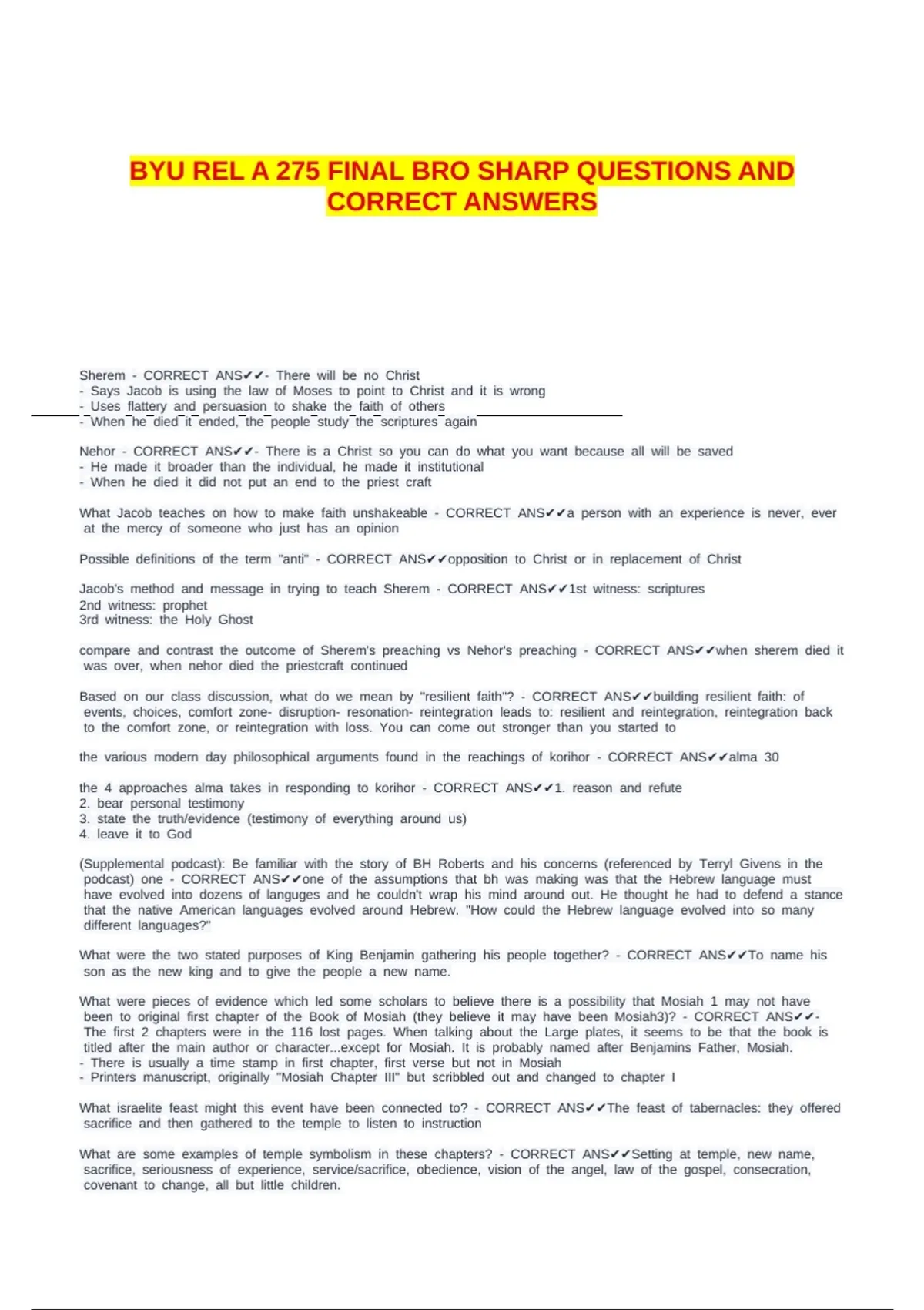 BYU REL A 275 FINAL BRO SHARP QUESTIONS AND CORRECT ANSWERS