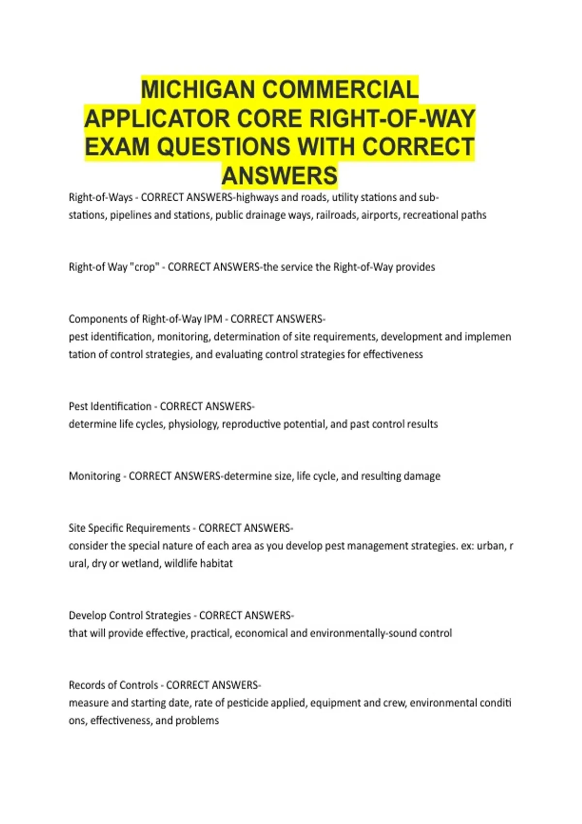 MICHIGAN COMMERCIAL APPLICATOR CORE RIGHT-OF-WAY EXAM QUESTIONS WITH CORRECT ANSWERS.pdf
