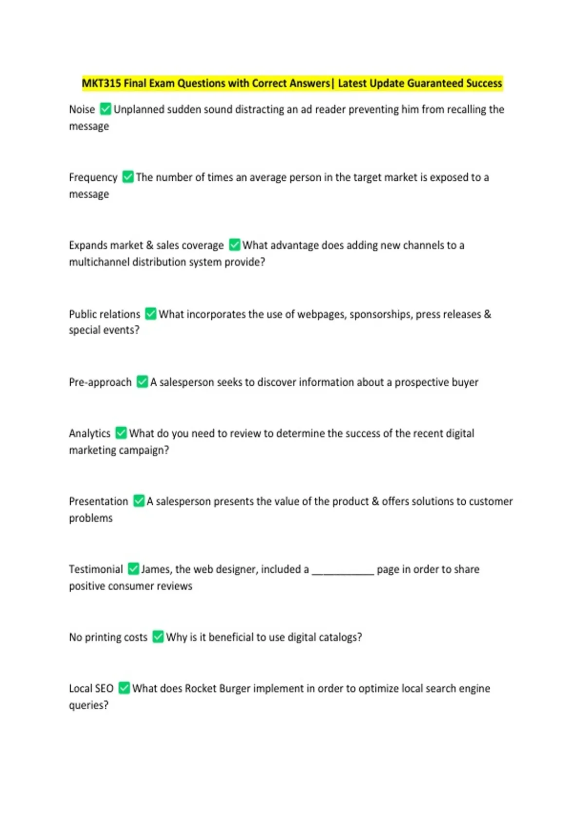MKT315 Final Exam Questions with Correct Answers| Latest Update Guaranteed Success