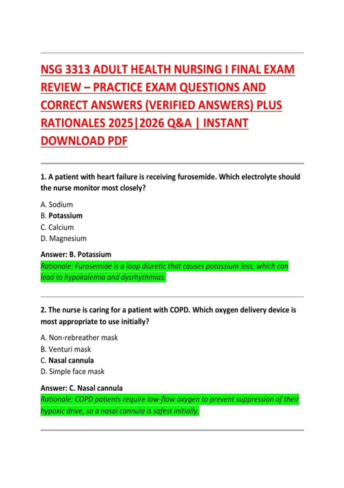 NSG 3313 Adult Health Nursing I Final Exam Review Test Bank Verified Questions Answers 2025/ 2026