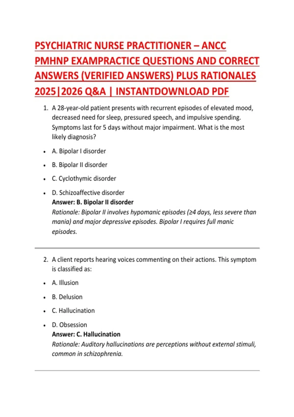 Psychiatric Nurse Practitioner ANCC PMHNP Exam Practice Test Bank Verified Questions Answers 2025/ 2026