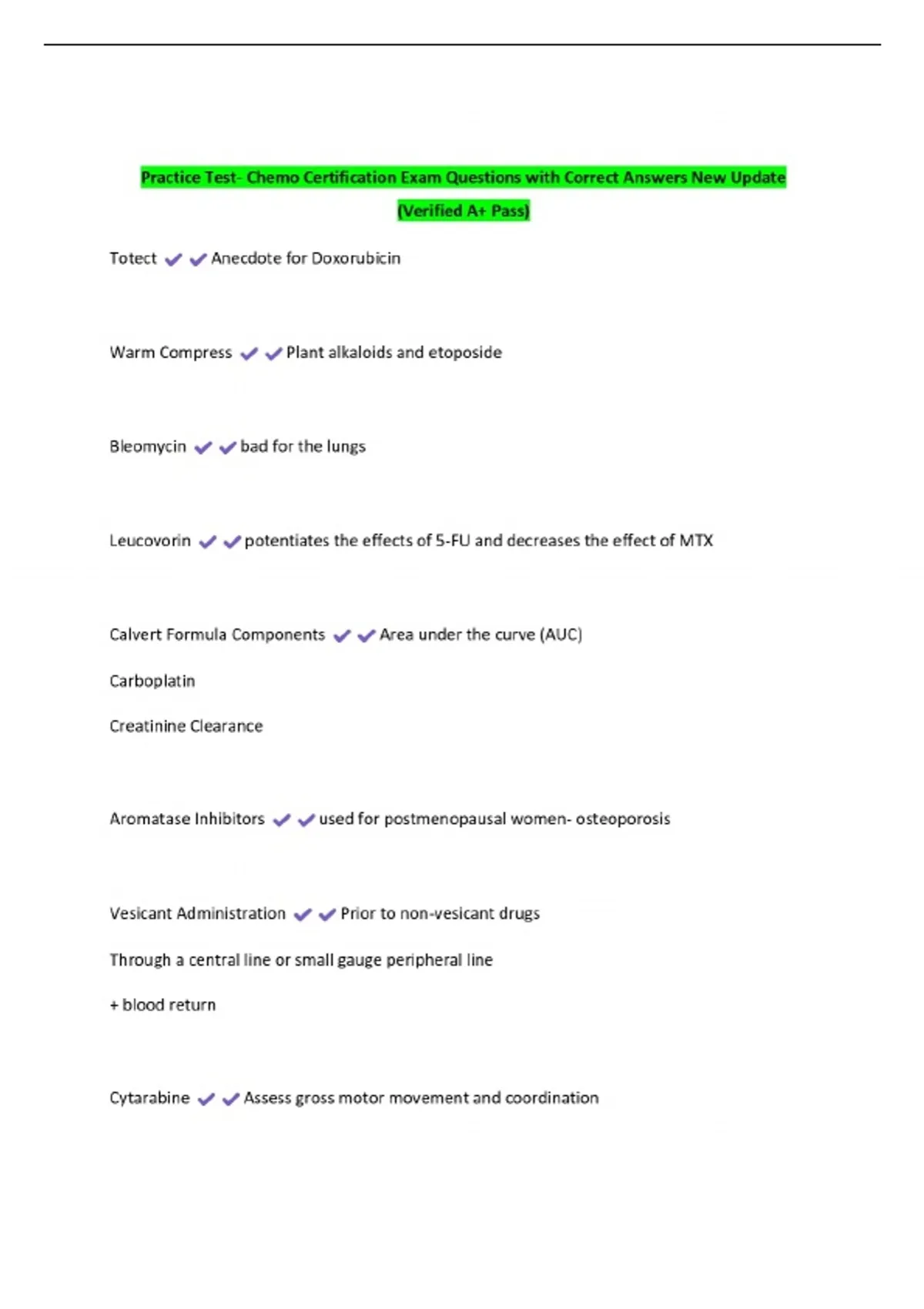Practice Test- Chemo Certification Exam Questions with Correct Answers New Update (Verified A+ Pass)