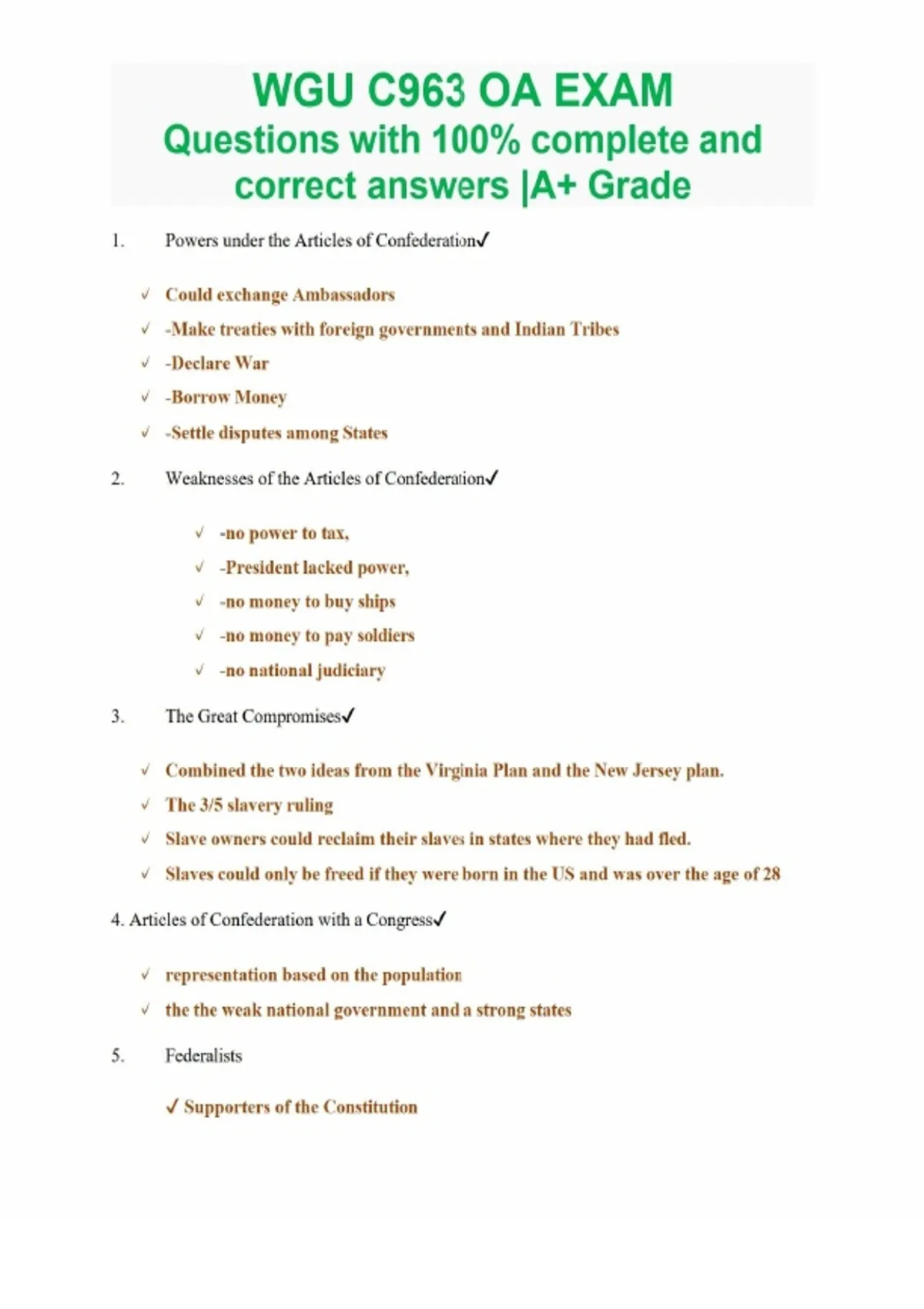 Master the foundations of American government with this 2026 exam bank for the WGU C963 American Politics Objective Assessment. This comprehensive resource provides verified questions and answers covering the US Constitution, the three branches of government, and the critical differences between the Articles of Confederation and the modern federal system. You will find detailed summaries of Federalist Papers #10 and #51, as well as clear explanations for the Lemon, Miller, and Sherbert tests used in landmark judicial reviews. The guide simplifies complex legal concepts, including the levels of judicial scrutiny, the exclusionary rule, and the specific instances where search warrants are not required. Whether you are distinguishing between reserved and concurrent powers or mastering the process of how a bill becomes a law, this guide provides the technical precision and clinical clarity needed to secure an A+ and navigate the complexities of American political science.