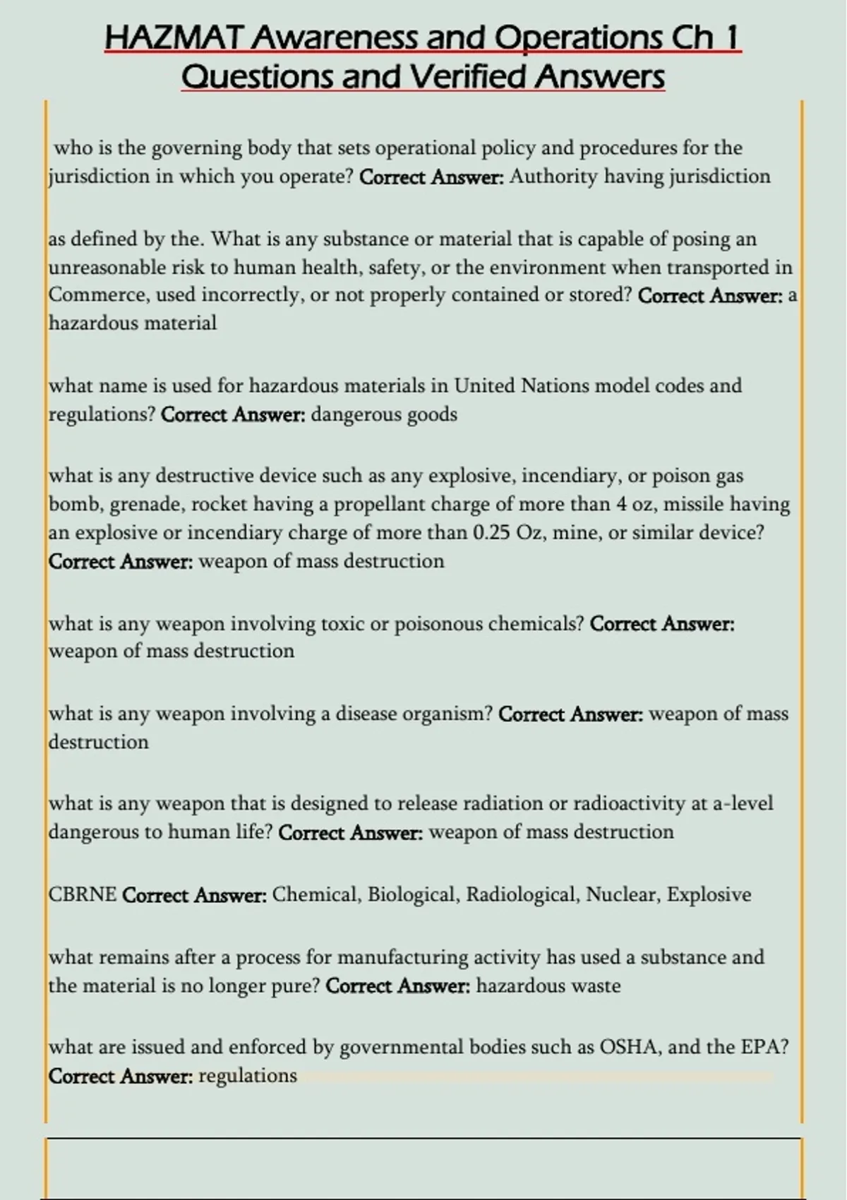 HAZMAT Awareness and Operations Ch 1 Questions and Verified Answers