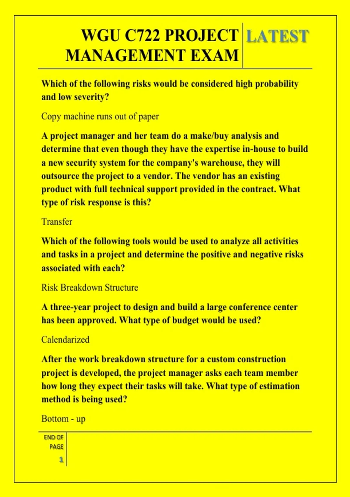 WGU C722 PROJECT MANAGEMENT EXAM QUESTIONS AND ANSWERS 2026