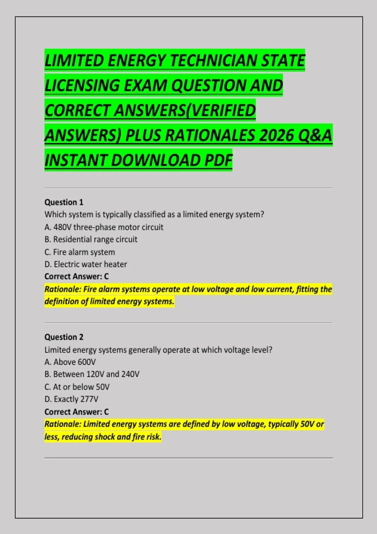 LIMITED ENERGY TECHNICIAN STATE LICENSING EXAM QUESTION AND CORRECT ANSWERS(VERIFIED ANSWERS) PLUS RATIONALES 2026 Q&A INSTANT DOWNLOAD PDF