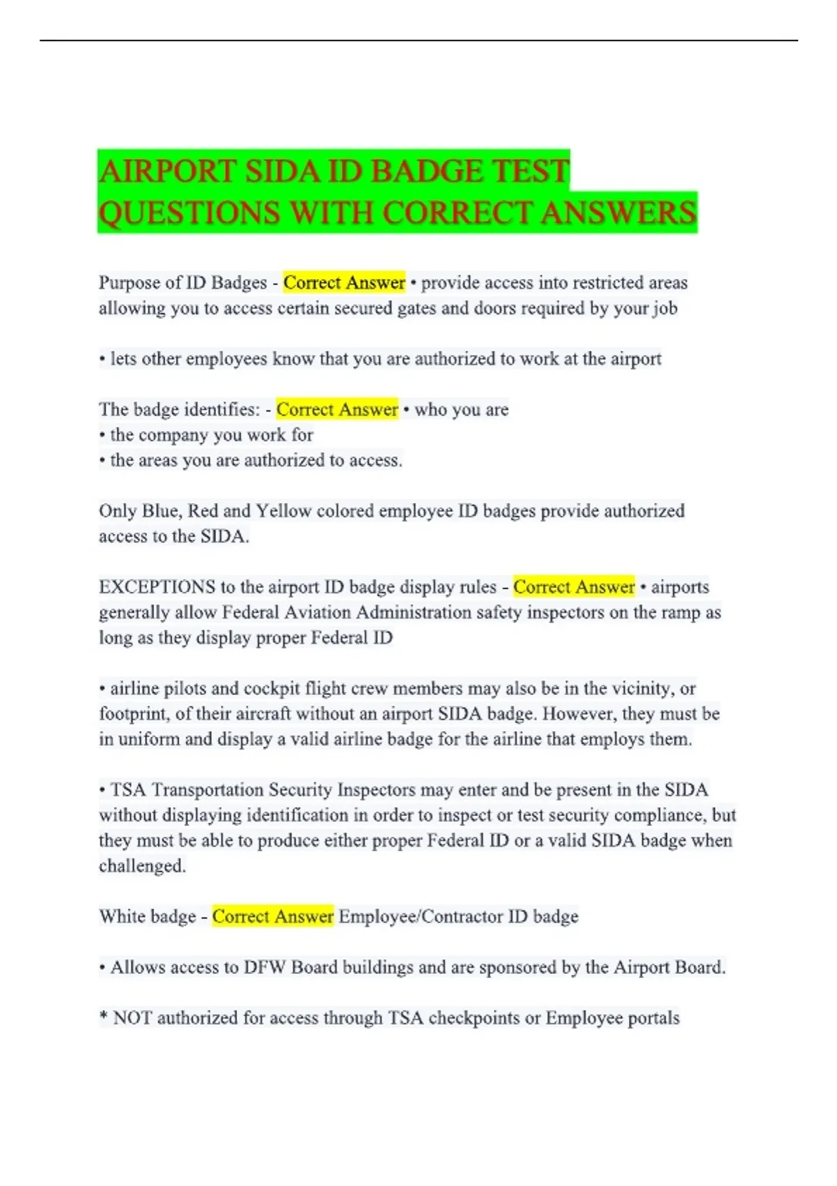 Airport SIDA id badge Exam Test Questions With 100% Correct Answers New 2026 Update Purpose of ID Badges - CORRECT ANSWER• provide access into restricted areas allowing you to access certain secured gates and doors required by your job • lets other employees know that you are authorized to work at the airport The badge identifies: - CORRECT ANSWER• who you are • the company you work for • the areas you are authorized to access. Only Blue, Red and Yellow colored employee ID badges provide authorized access to the SIDA. EXCEPTIONS to the airport ID badge display rules - CORRECT ANSWER• airports generally allow Federal Aviation Administration safety inspectors on the ramp as long as they display proper Federal ID • airline pilots and cockpit flight crew members may also be in the vicinity, or footprint, of their aircraft without an airport SIDA badge. However, they must be in uniform and display a valid airline badge for the airline that employs them. • TSA Transportation Security Inspectors may enter and be present in the SIDA without displaying identification in order to inspect or test security compliance, but they must be able to produce either proper Federal ID or a valid SIDA badge when challenged. White badge - CORRECT ANSWEREmployee/Contractor ID badge • Allows access to DFW Board buildings and are sponsored by the Airport Board. * NOT authorized for access through TSA checkpoints or Employee portals * NOT authorized for unescorted access through AOA gates, in the SIDA or the Sterile areas of the terminals. Green badge - CORRECT ANSWERNon-SIDA • Allows access into the Sterile areas of the airport terminals after successfully completing the TSA screening process. * NOT authorized to use the Employee Portals or to be unescorted in the SIDA.
