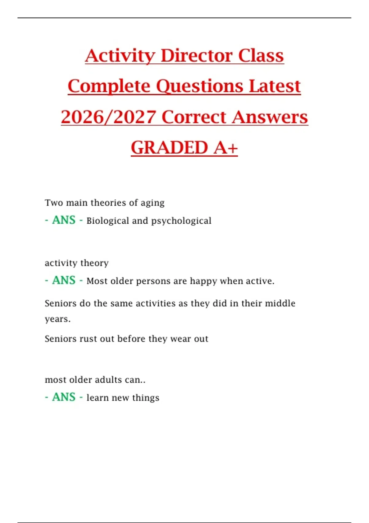 This document includes complete Activity Director class questions with correct answers updated for the 2026–2027 academic year. It covers core responsibilities, planning strategies, regulations, and best practices, making it ideal for certification preparation, coursework review, and competency assessment.