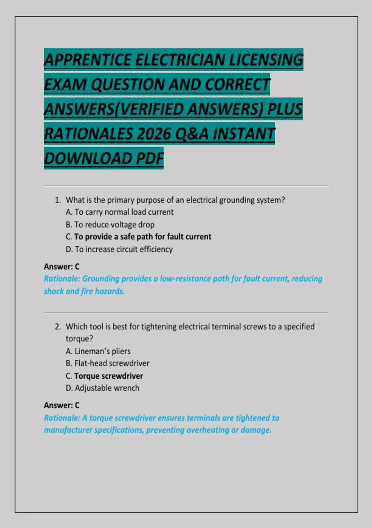APPRENTICE ELECTRICIAN LICENSING EXAM QUESTION AND CORRECT ANSWERS(VERIFIED ANSWERS) PLUS RATIONALES 2026 Q&A INSTANT DOWNLOAD PDF