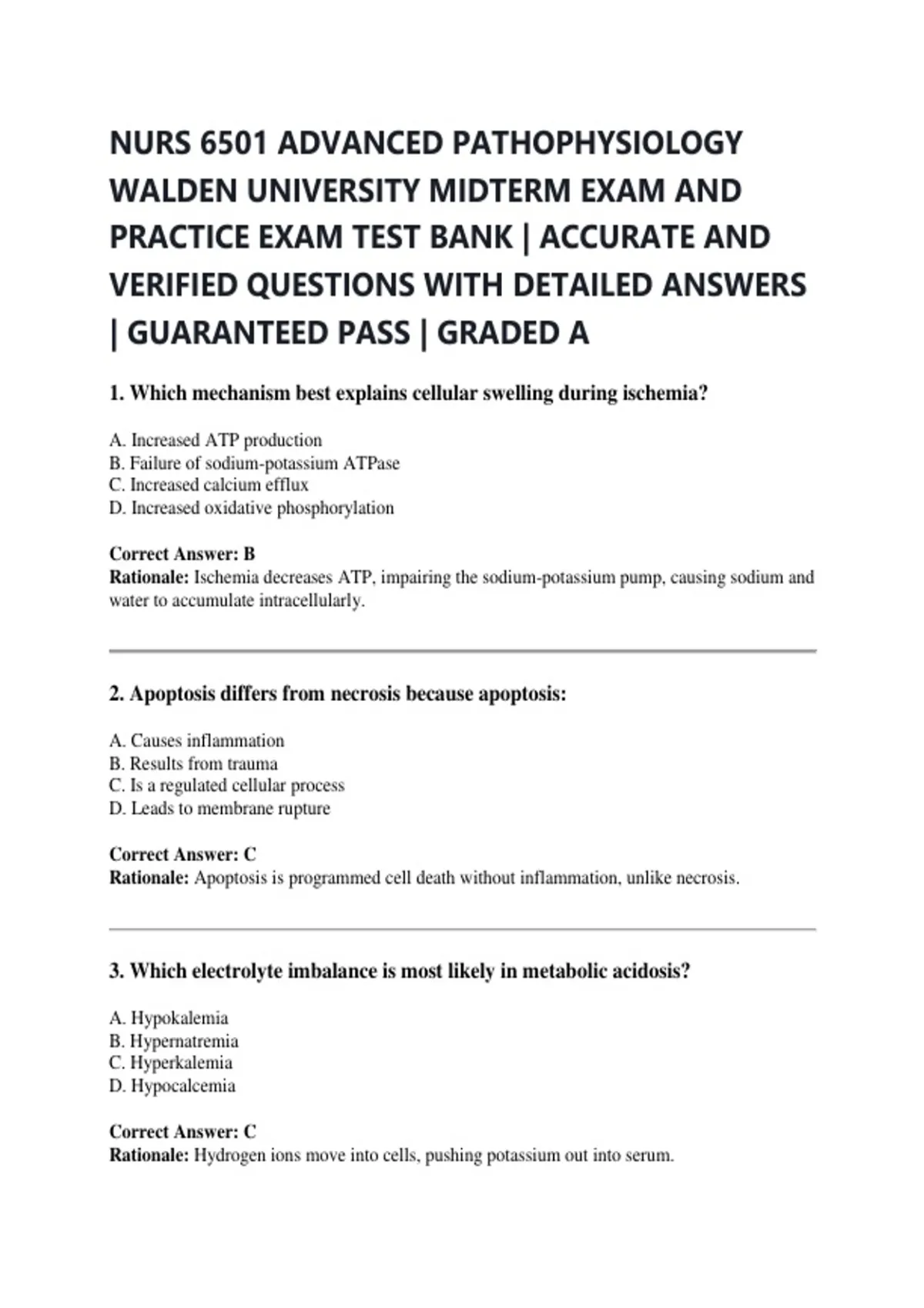 NURS 6501 ADVANCED PATHOPHYSIOLOGY WALDEN UNIVERSITY MIDTERM EXAM AND PRACTICE EXAM TEST BANK | ACCURATE AND VERIFIED QUESTIONS WITH DETAILED ANSWERS | GUARANTEED PASS | GRADED A