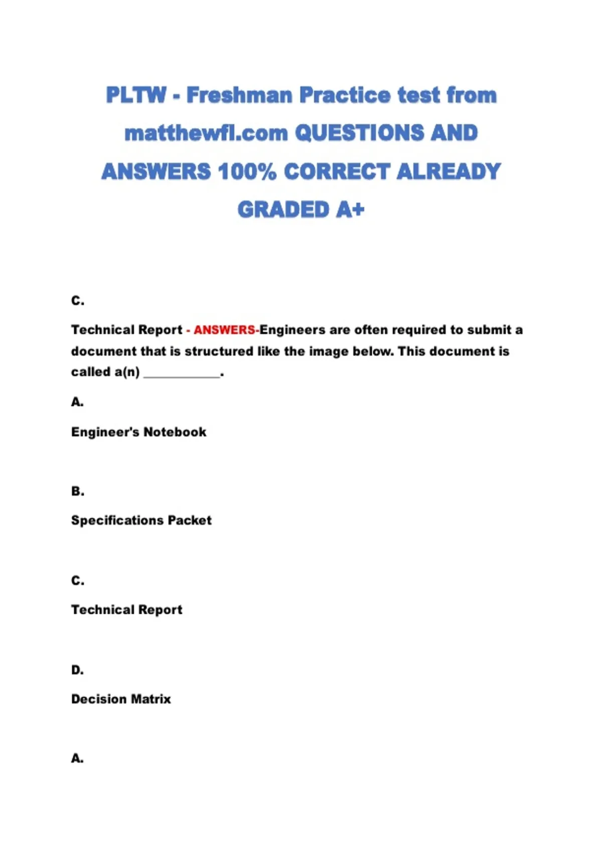 PLTW - Freshman Practice test from QUESTIONS AND ANSWERS 100% CORRECT ALREADY GRADED A+