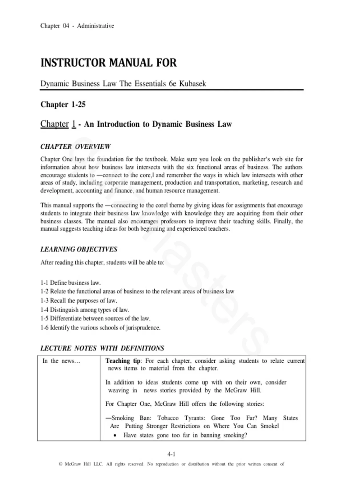 This document provides the complete Solutions Manual for Dynamic Business Law: The Essentials (6th Edition) by Kubasek and Browne. It includes detailed, step-by-step solutions and explanations for end-of-chapter questions, case briefs, ethical dilemmas, and applied legal scenarios presented in the textbook. Topics cover the legal environment of business, contracts, torts, intellectual property, employment law, business ethics, and regulatory compliance. This comprehensive solutions manual is ideal for coursework support and instructor use in business law programs.