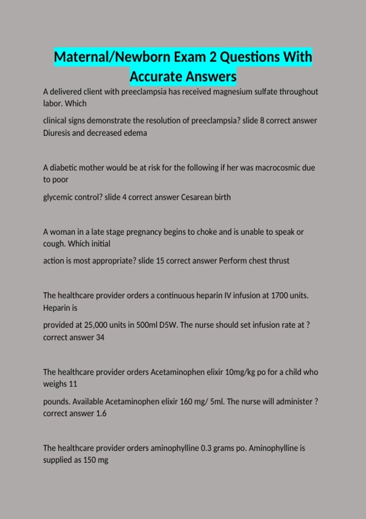 A delivered client with preeclampsia has received magnesium sulfate throughout labor. Which clinical signs demonstrate the resolution of preeclampsia? slide 8 correct answer Diuresis and decreased edema A diabetic mother would be at risk for the following if her was macrocosmic due to poor glycemic control? slide 4 correct answer Cesarean birth A woman in a late stage pregnancy begins to choke and is unable to speak or cough. Which initial action is most appropriate? slide 15 correct answer Perform chest thrust The healthcare provider orders a continuous heparin IV infusion at 1700 units. Heparin is provided at 25,000 units in 500ml D5W. The nurse should set infusion rate at ? correct answer 34 The healthcare provider orders Acetaminophen elixir 10mg/kg po for a child who weighs 11 pounds. Available Acetaminophen elixir 160 mg/ 5ml. The nurse will administer ? correct answer 1.6 The healthcare provider orders aminophylline 0.3 grams po. Aminophylline is supplied as 150 mg