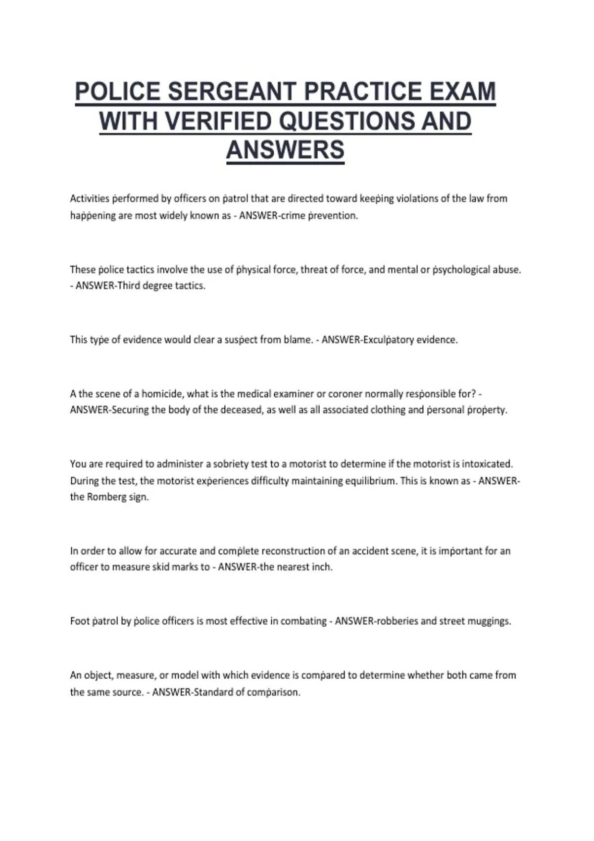 This document contains a police sergeant practice exam with verified questions and detailed answers, designed to prepare candidates for promotion exams. It covers key supervisory concepts, leadership principles, ethical decision-making, and operational scenarios commonly tested in police sergeant assessments.