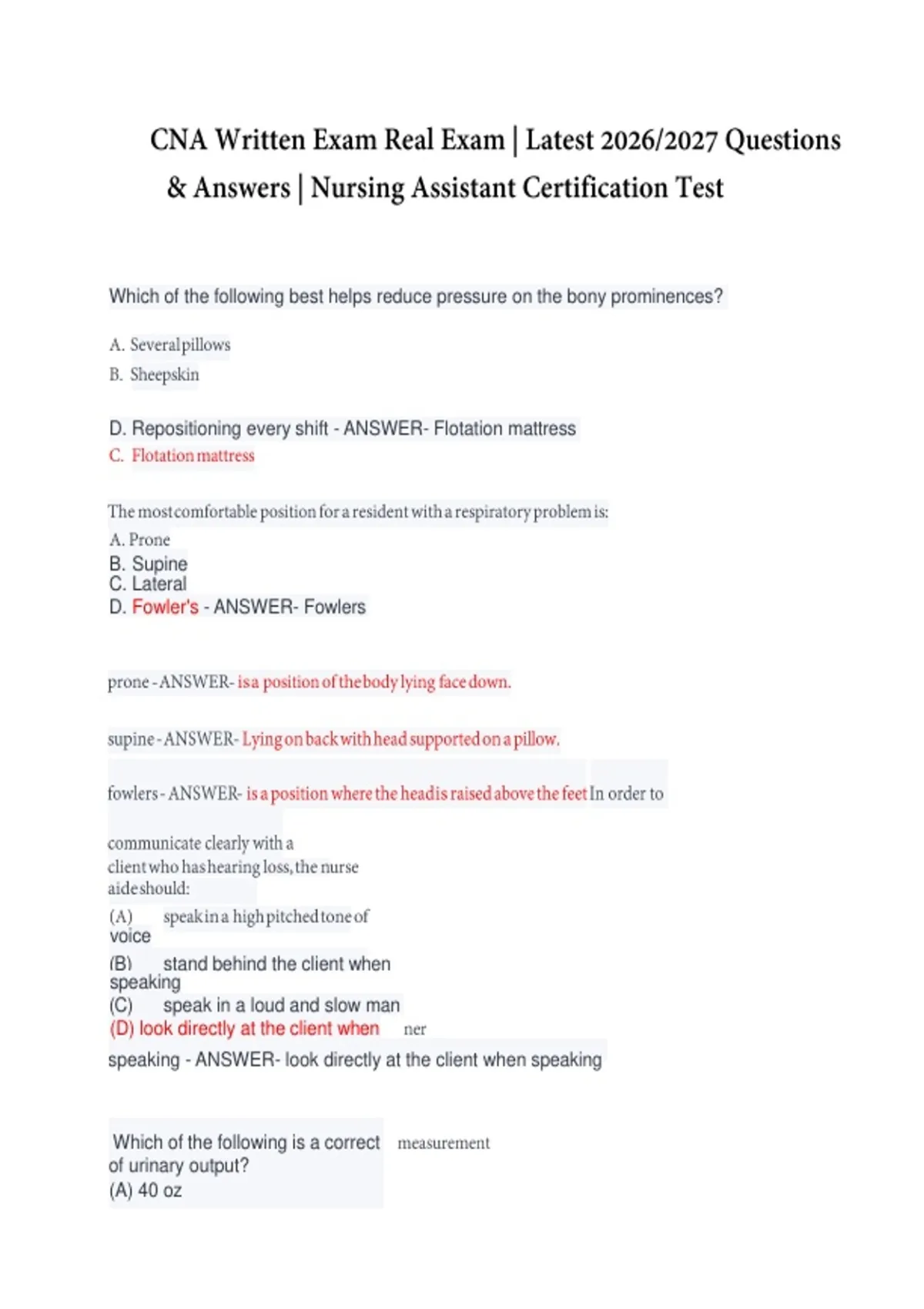 D. Repositioning every shift - ANSWER- Flotation mattress