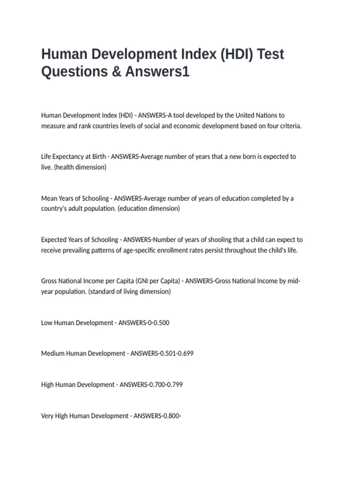 Human Development Index (HDI) - ANSWERS-A tool developed by the United Nations to