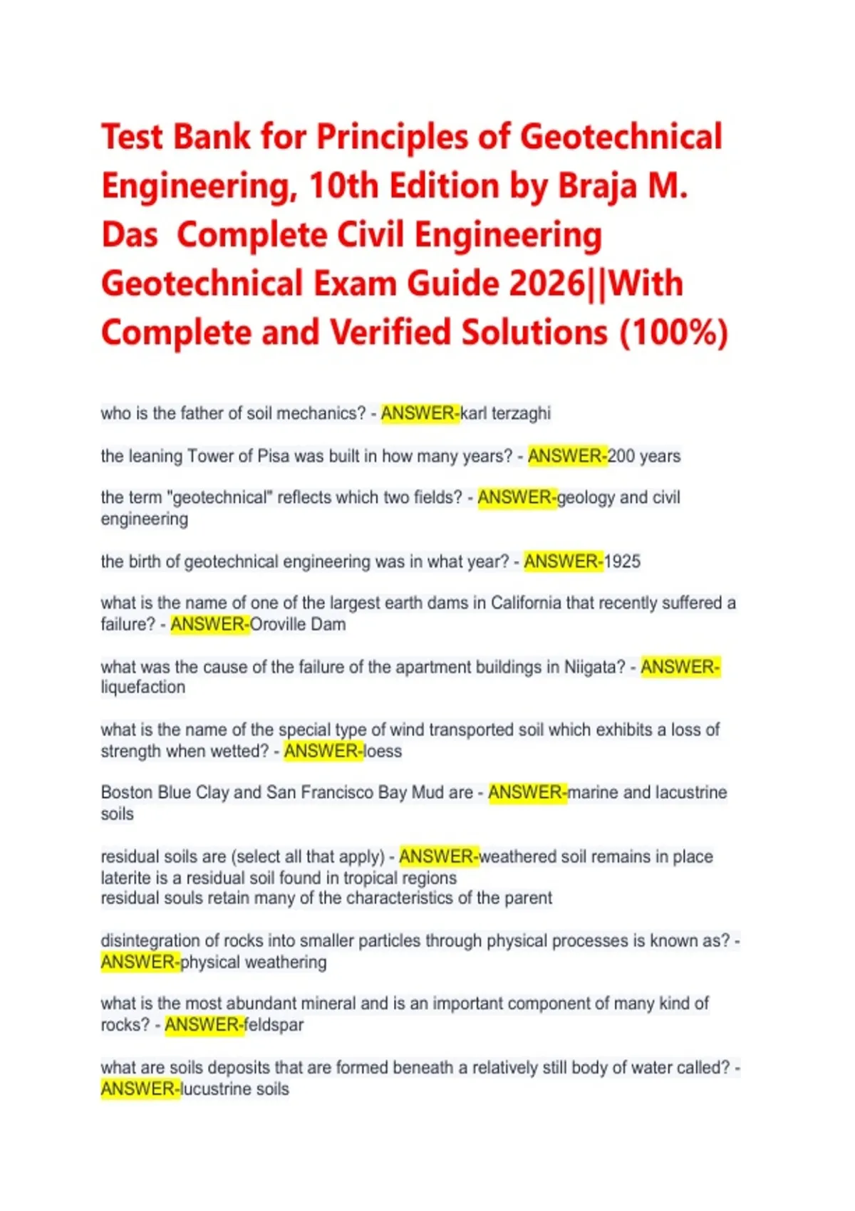 Ace your civil engineering geotechnical exams with the complete Test Bank for Principles of Geotechnical Engineering, 10th Edition by Braja M. Das. This 2026 exam guide includes 100% complete and verified solutions for all chapters. Perfect for mastering key concepts, practicing for quizzes, and ensuring top grades. Download your comprehensive study resource today.