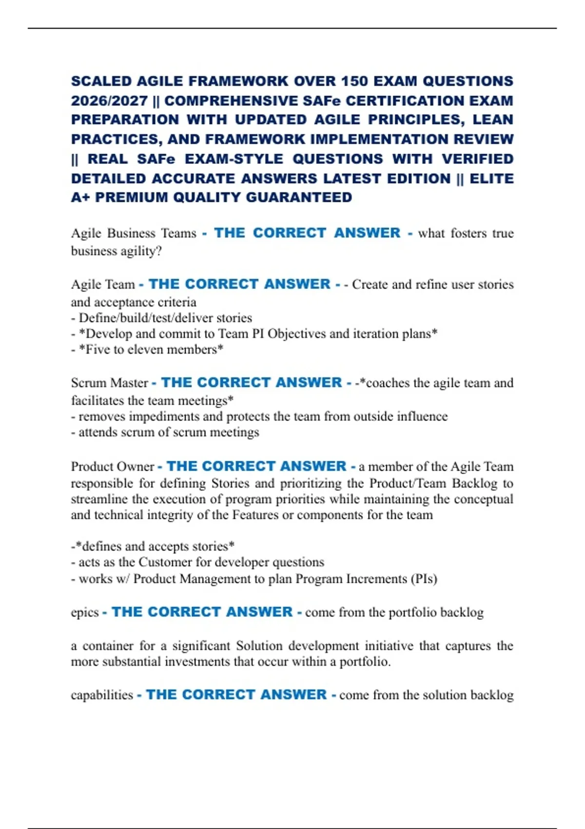 SCALED AGILE FRAMEWORK OVER 150 EXAM QUESTIONS 2026/2027 || COMPREHENSIVE SAFe CERTIFICATION EXAM PREPARATION WITH UPDATED AGILE PRINCIPLES, LEAN PRACTICES, AND FRAMEWORK IMPLEMENTATION REVIEW || REAL SAFe EXAM-STYLE QUESTIONS WITH VERIFIED DETAILED ACCURATE ANSWERS LATEST EDITION || ELITE A+ PREMIUM QUALITY GUARANTEED Agile Business Teams - THE CORRECT ANSWER - what fosters true business agility? Agile Team - THE CORRECT ANSWER - - Create and refine user stories and acceptance criteria - Define/build/test/deliver stories - *Develop and commit to Team PI Objectives and iteration plans* - *Five to eleven members* Scrum Master - THE CORRECT ANSWER - -*coaches the agile team and facilitates the team meetings* - removes impediments and protects the team from outside influence - attends scrum of scrum meetings Product Owner - THE CORRECT ANSWER - a member of the Agile Team responsible for defining Stories and prioritizing the Product/Team Backlog to streamline the execution of program priorities while maintaining the conceptual and technical integrity of the Features or components for the team