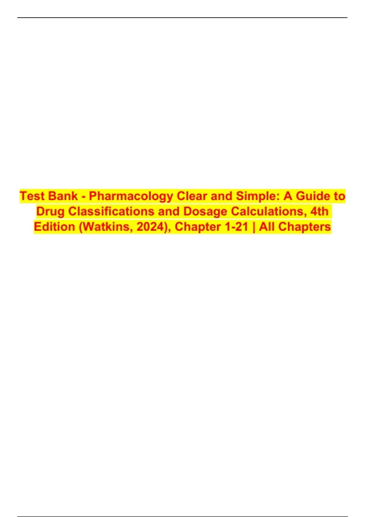 Get the complete Pharmacology Clear and Simple 4th Edition test bank with solution by Watkins, covering drug classifications and dosage calculations across Chapters 1–21. This comprehensive exam prep resource helps strengthen pharmacology understanding, improve calculation accuracy, and boost exam success with updated content for 2025/ 2026.