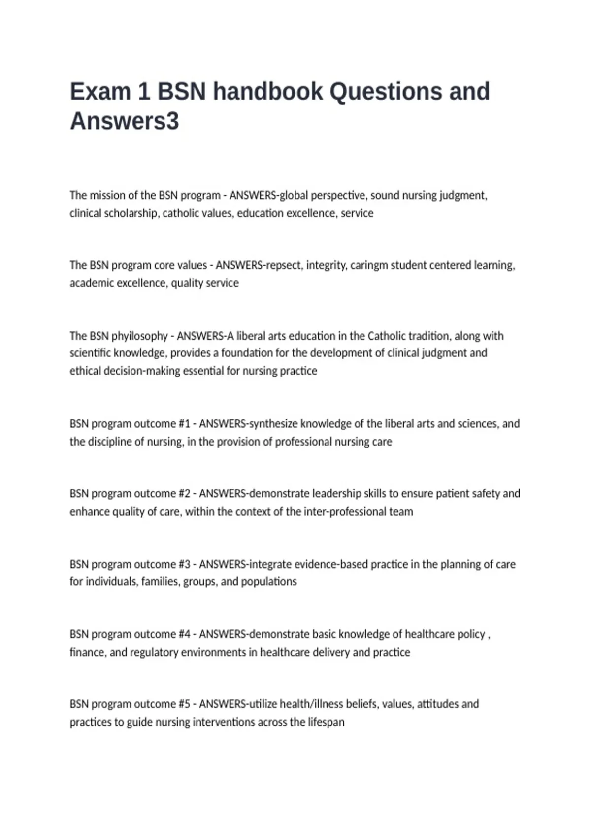 The BSN phyilosophy - ANSWERS-A liberal arts education in the Catholic tradition, along with