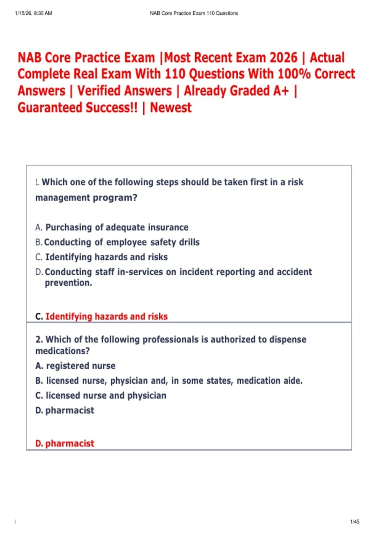 NAB Core Practice Exam |Most Recent Exam 2026 | Actual Complete Real Exam With 110 Questions With 100% Correct Answers | Verified Answers | Already Graded A+ | Guaranteed Success!! | Newest