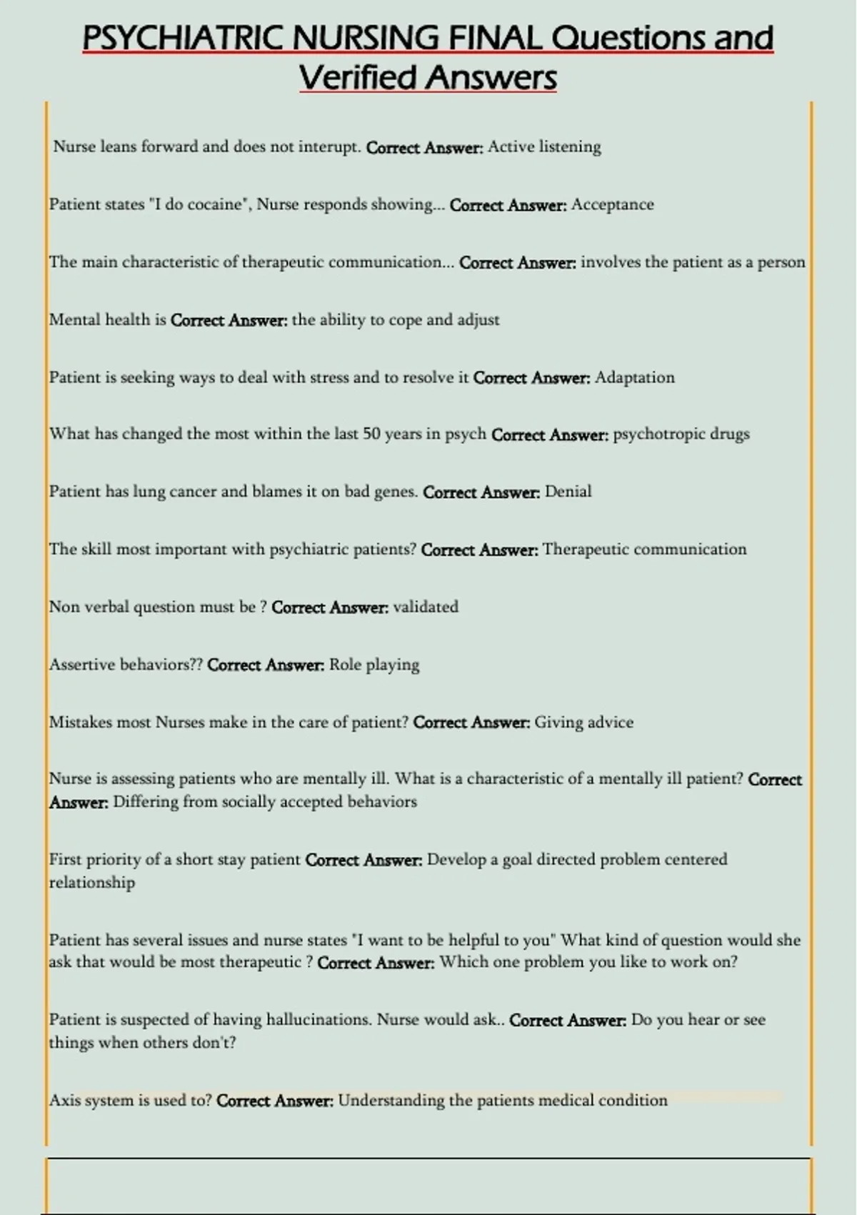 PSYCHIATRIC NURSING FINAL Questions and