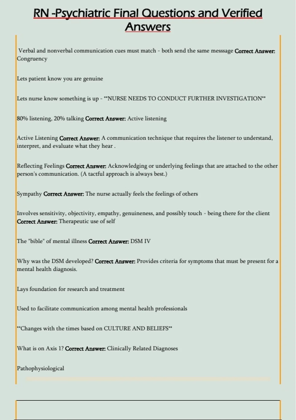 RN -Psychiatric Final Questions and Verified