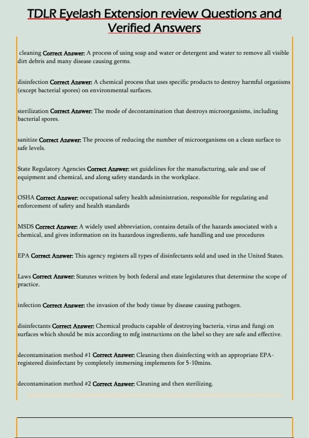 sterilization Correct Answer: The mode of decontamination that destroys microorganisms, including