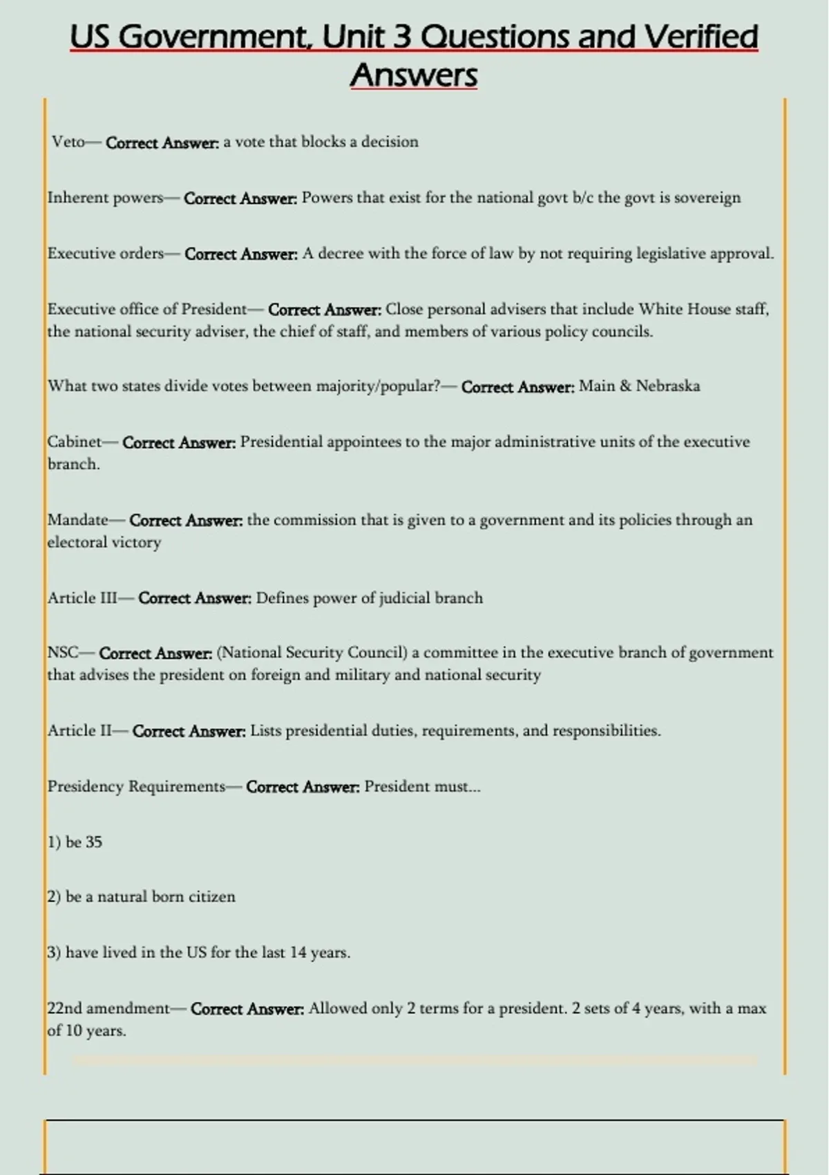US Government, Unit 3 Questions and Verified
