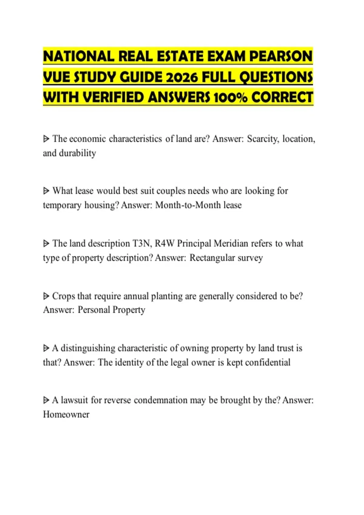 NATIONAL REAL ESTATE EXAM PEARSON VUE STUDY GUIDE 2026 FULL QUESTIONS WITH VERIFIED ANSWERS 100% CORRECT