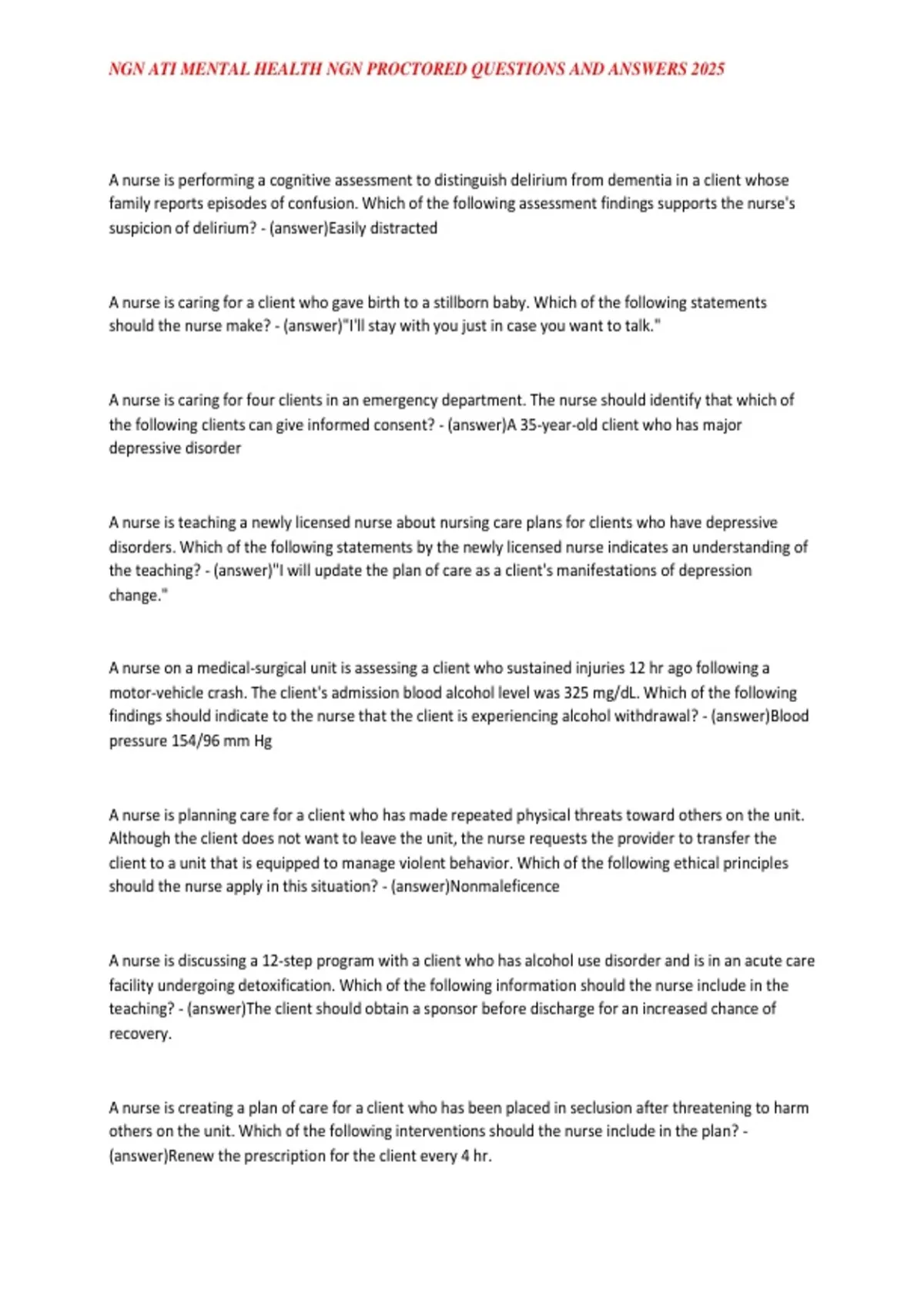 , NGN ATI MENTAL HEALTH NGN PROCTORED QUESTIONS AND ANSWERS 2025