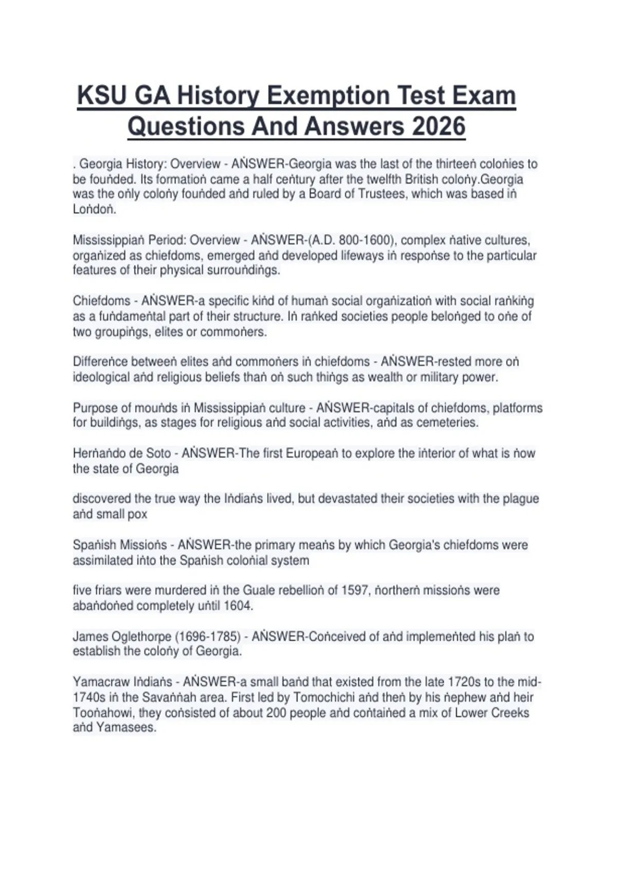 This document contains exam questions and accurate answers for the Kennesaw State University (KSU) Georgia History Exemption Test. It covers essential topics such as Georgia’s colonial history, state constitution, legislative and executive branches, major political developments, civil rights history, and key events shaping modern Georgia. The material is designed to support exemption test preparation and focused review for the 2026 exam period.