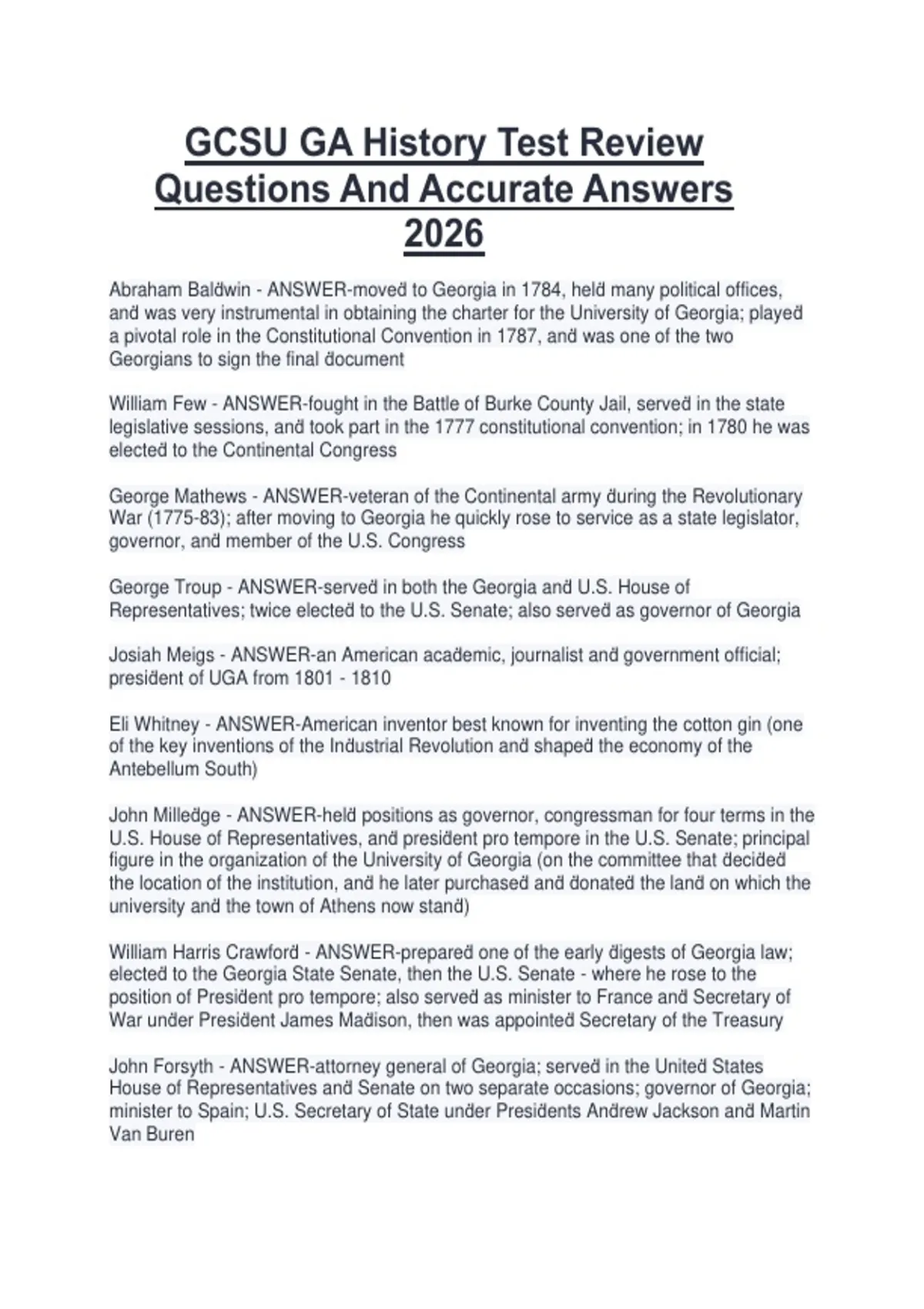 This test review document contains review questions and accurate answers for the Georgia History exam at Georgia College & State University (GCSU). It covers major topics such as Georgia’s colonial foundations, state constitution, legislative and executive branches, political developments, civil rights history, and key events in modern Georgia. The material is designed to support focused review and effective exam preparation for the 2026 test.