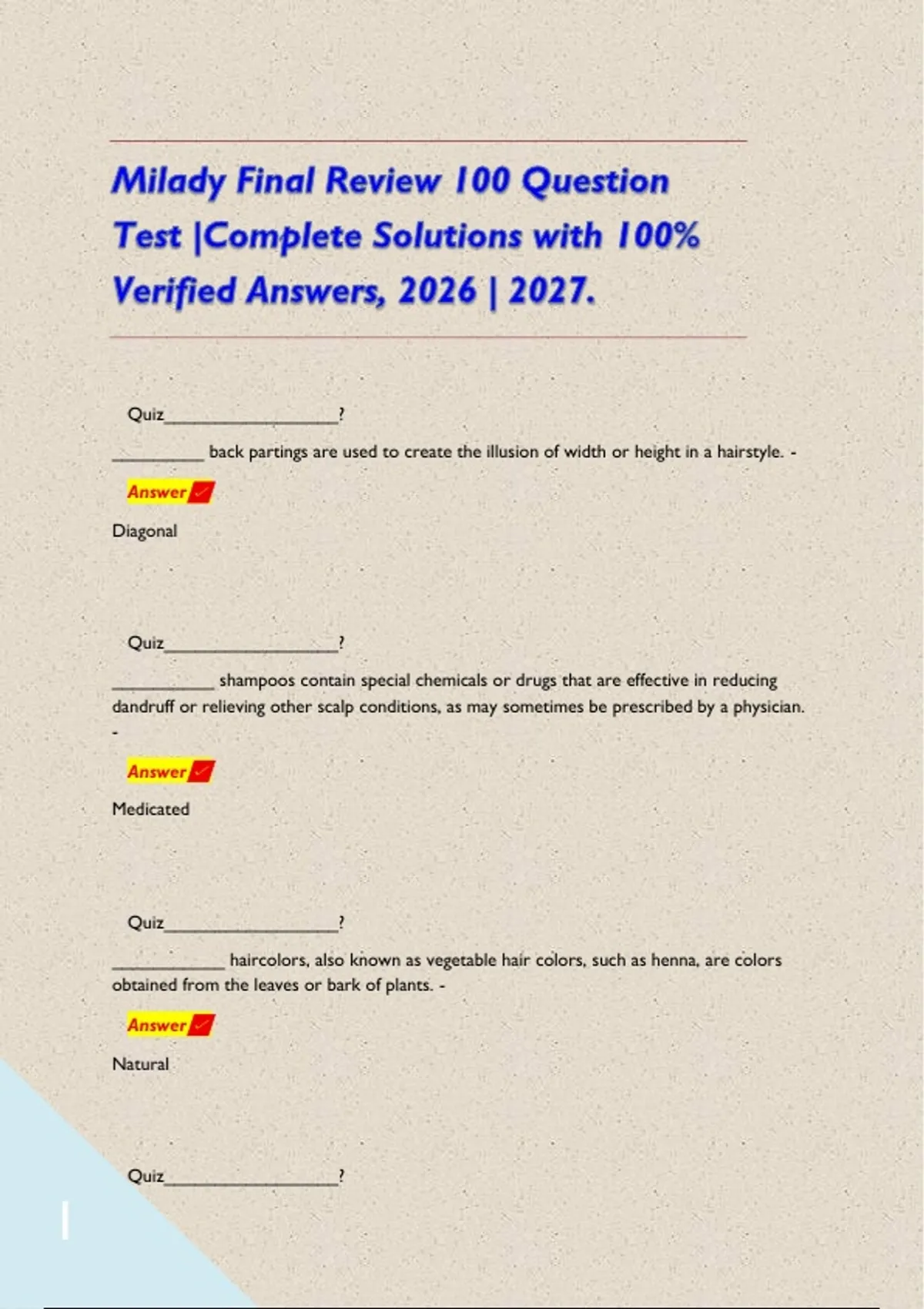 Milady Final Review 100 Question Test |Complete Solutions with 100% Verified Answers, 2026 | 2027. Quiz_________________? _________ back partings are used to create the illusion of width or height in a hairstyle. - Answer Diagonal Quiz_________________? __________ shampoos contain special chemicals or drugs that are effective in reducing dandruff or relieving other scalp conditions, as may sometimes be prescribed by a physician. - Answer Medicated Quiz_________________? ___________ haircolors, also known as vegetable hair colors, such as henna, are colors obtained from the leaves or bark of plants. - Answer Natural Quiz_________________? ____________, often found in home haircoloring products, leave a coating on the hair that may cause uneven curls, severe discoloration, or hair breakage. - Answer Metallic salts Quiz_________________? A ________ is a head-shaped form, usually made of canvas-covered cork or Styrofoam, on which the wig is secured for fitting, coloring, and sometimes styling. - Answer block Quiz_________________? A __________ shampoo is designed to re-balance the pH level of your hair by neutralizing any alkali and unwanted residues in the hair. - Answer neutralizing Quiz_________________? A hair removal service should not be performed on client's taking a medication containing __________. - Answer Retin-A Quiz_________________? A long chain of amino acids linked by peptide bonds is called a ________ chain. - Answer polypeptide Quiz_________________? A pimple or an abscess is an example of a __________. - Answer local infection Quiz_________________? A professional ___________ is responsible for educating clients about at-home maintenance and styling options for their hair. - Answer hairstylist Quiz_________________? A salon can be thought of as a team environment that requires that you practice and perfect your ________. - Answer people skills Quiz_________________? A stylist should recommend a hair or scalp treatment only after having performed a(n) ________. - Answer hair and scalp examination Quiz_________________? A trash container ________ is one of the best ways to prevent excessive odors and vapors in the salon. - Answer with a self-closing lid Quiz_________________? A(n) __________ can be defined as an artificial covering for the head that consists of a network of interwoven hair and completely covers the client's hair. - Answer wig Quiz_________________? According to your texts, the GHS gives workers the right to ________. - Answer understand safety concerns associated with chemicals Quiz_________________? After your salon visit, it is customary to __________. - Answer send a thank-you note Quiz_________________? Any color that is significantly deeper or darker than the client's skin tone is considered a ________. - Answer contour color Quiz_________________? Application of the enhancement product onto the new growth of the nail is commonly referred to as __________. - Answer backfill Quiz_________________? Backbrushing, also known as ________, is used to build a soft cushion or to mesh two or more curl patterns together for a uniform and smooth comb out. - Answer ruffing