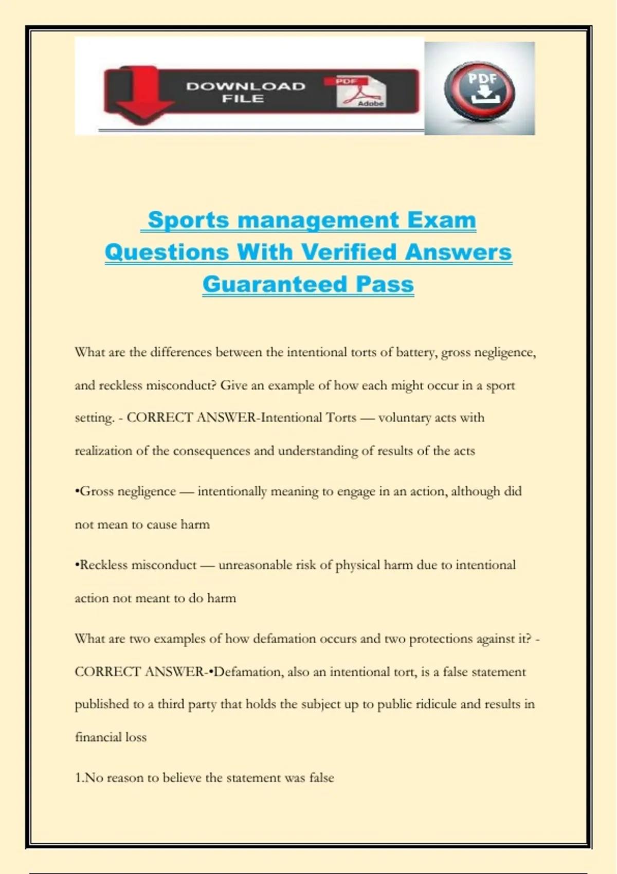 Sports management Exam Questions With Verified Answers Guaranteed Pass