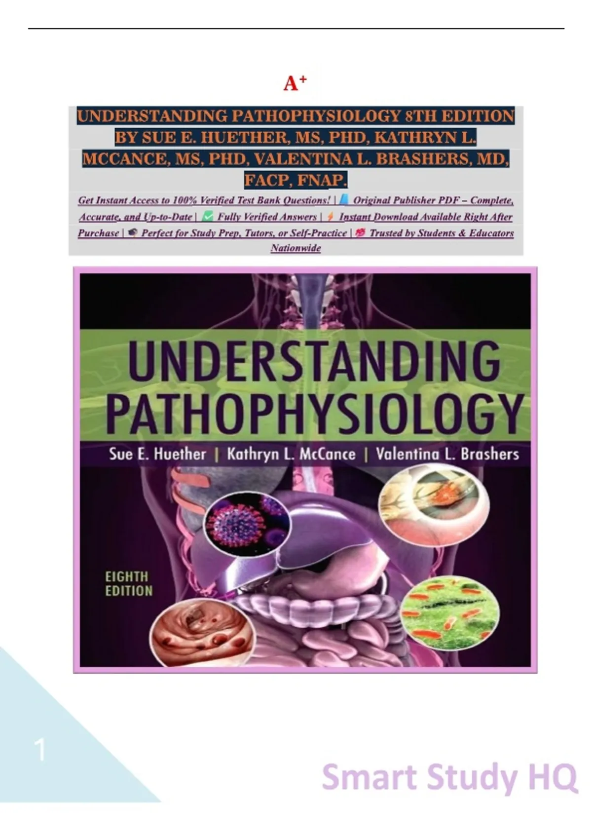 This Test Bank for Understanding Pathophysiology, 8th Edition by Sue E. Huether et al. is a comprehensive study resource for nursing and health sciences students. It includes chapter-by-chapter multiple-choice questions with verified answers, fully aligned with the 8th edition textbook. Topics covered include cellular function, inflammation, immune response, fluid and electrolyte balance, hematologic disorders, cardiovascular, respiratory, renal, gastrointestinal, endocrine, neurologic, and musculoskeletal pathophysiology, as well as genetics, infectious diseases, and oncology. Questions are designed to improve critical thinking, clinical reasoning, and application of pathophysiologic principles in real-world patient scenarios. Ideal for RN, BSN, PN/LPN, and allied health students, this test bank is perfect for quizzes, midterms, finals, NCLEX preparation, and ATI/HESI review. It is also a valuable resource for instructors creating assessments based on the Huether 8th edition curriculum.
