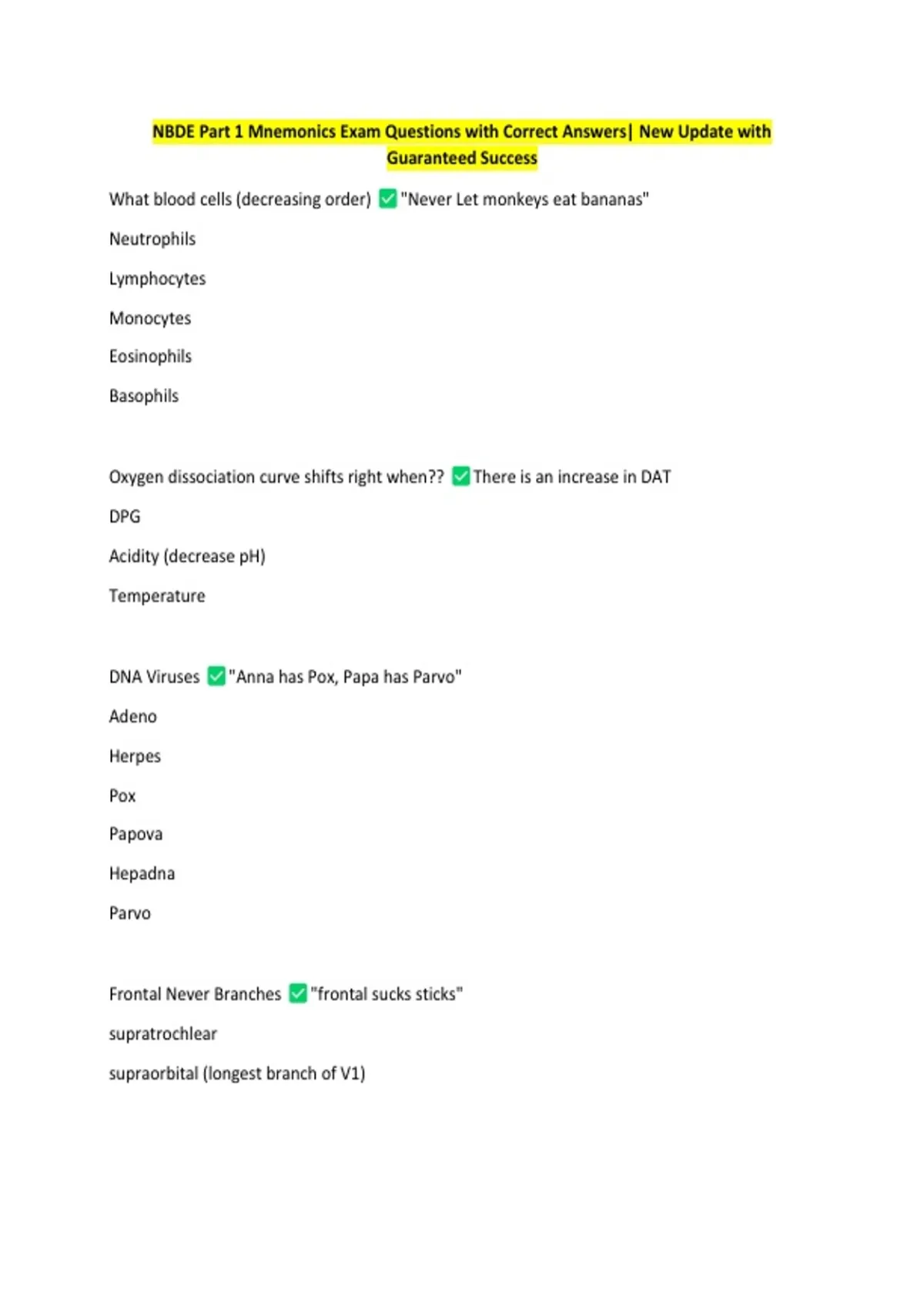 NBDE Part 1 Mnemonics Exam Questions with Correct Answers| New Update with