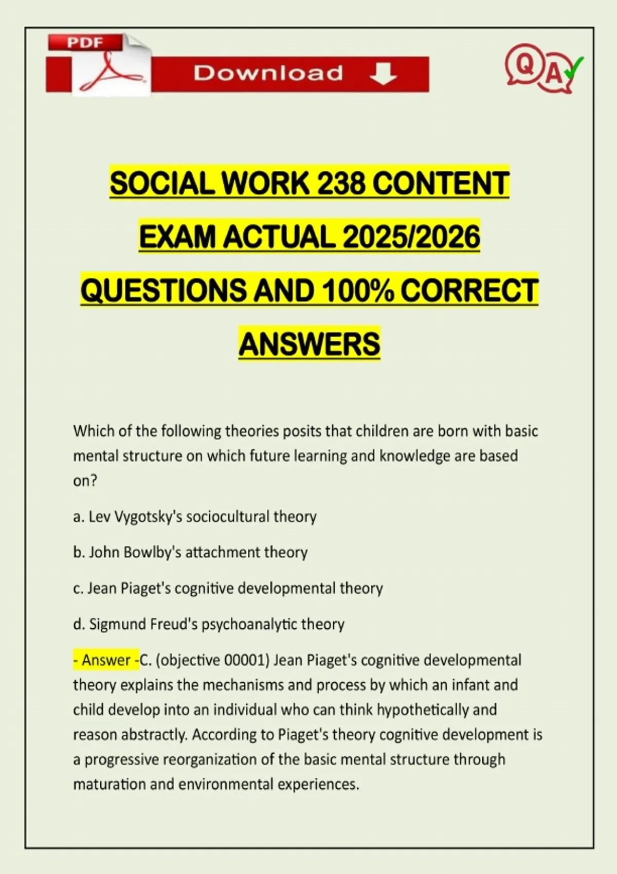 SOCIAL WORK 238 CONTENT EXAM ACTUAL 2025/2026 QUESTIONS AND 100% CORRECT ANSWERS Which of the following theories posits that children are born with basic mental structure on which future learning and knowledge are based on? a. Lev Vygotsky's sociocultural theory b. John Bowlby's attachment theory c. Jean Piaget's cognitive developmental theory d. Sigmund Freud's psychoanalytic theory - Answer -C. (objective 00001) Jean Piaget's cognitive developmental theory explains the mechanisms and process by which an infant and child develop into an individual who can think hypothetically and reason abstractly. According to Piaget's theory cognitive development is a progressive reorganization of the basic mental structure through maturation and environmental ex