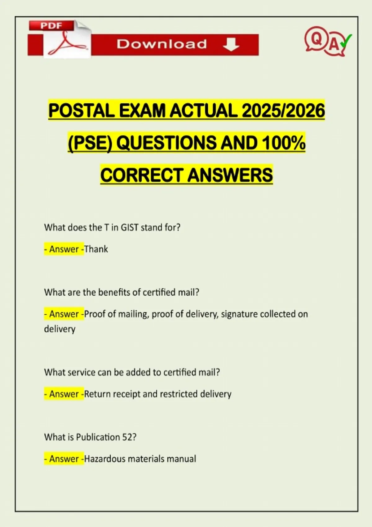 POSTAL EXAM ACTUAL 2025/2026 (PSE) QUESTIONS AND 100% CORRECT ANSWERS What does the T in GIST stand for? - Answer -Thank What are the benefits of certified mail? - Answer -Proof of mailing, proof of delivery, signature collected on delivery What service can be added to certified mail? - Answer -Return receipt and restricted delivery What is Publication 52? - Answer -Hazardous materials manualNeed assistance on Online classes, Exams & Assignments? Reach out for instant help!! Full Course Assistance, Plagiarism-free Essay Writing, Research Paper, Dissertation, Discussion Posts, etc…. Confidential & Secure services. Tutors are available for all subjects! Email now at: Certified mail can be added to? - Answer -First class and priority How much additional insurance can be purchased with GXG? - Answer -$2499 What is the maximum length+g