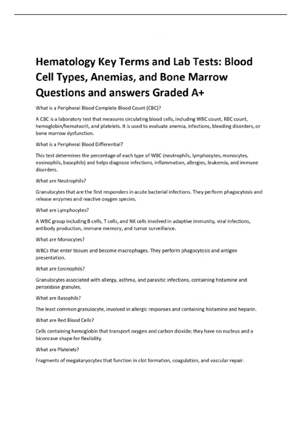 Hematology Key Terms and Lab Tests: Blood Cell Types, Anemias, and Bone Marrow Questions and answers Graded A+ What is a Peripheral Blood Complete Blood Count (CBC)? A CBC is a laboratory test that measures circulating blood cells, including WBC count, RBC count, hemoglobin/hematocrit, and platelets. It is used to evaluate anemia, infections, bleeding disorders, or bone marrow dysfunction. What is a Peripheral Blood Differential? This test determines the percentage of each type of WBC (neutrophils, lymphocytes, monocytes, eosinophils, basophils) and helps diagnose infections, inflammation, allergies, leukemia, and immune disorders. What are Neutrophils?