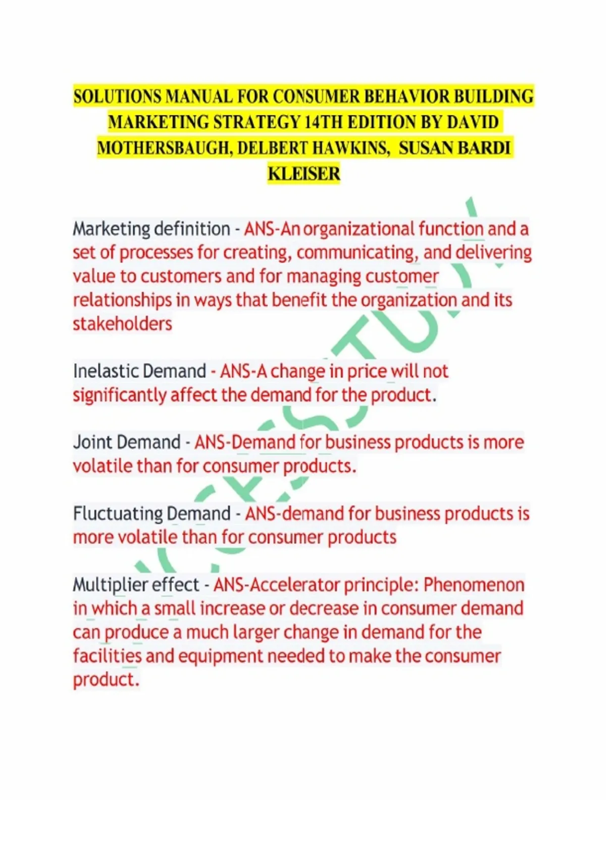 SOLUTIONS MANUAL FOR CONSUMER BEHAVIOR BUILDING MARKETING STRATEGY 14TH EDITION BY DAVID MOTHERSBAUGH, DELBERT HAWKINS, SUSAN BARDI KLEISER.