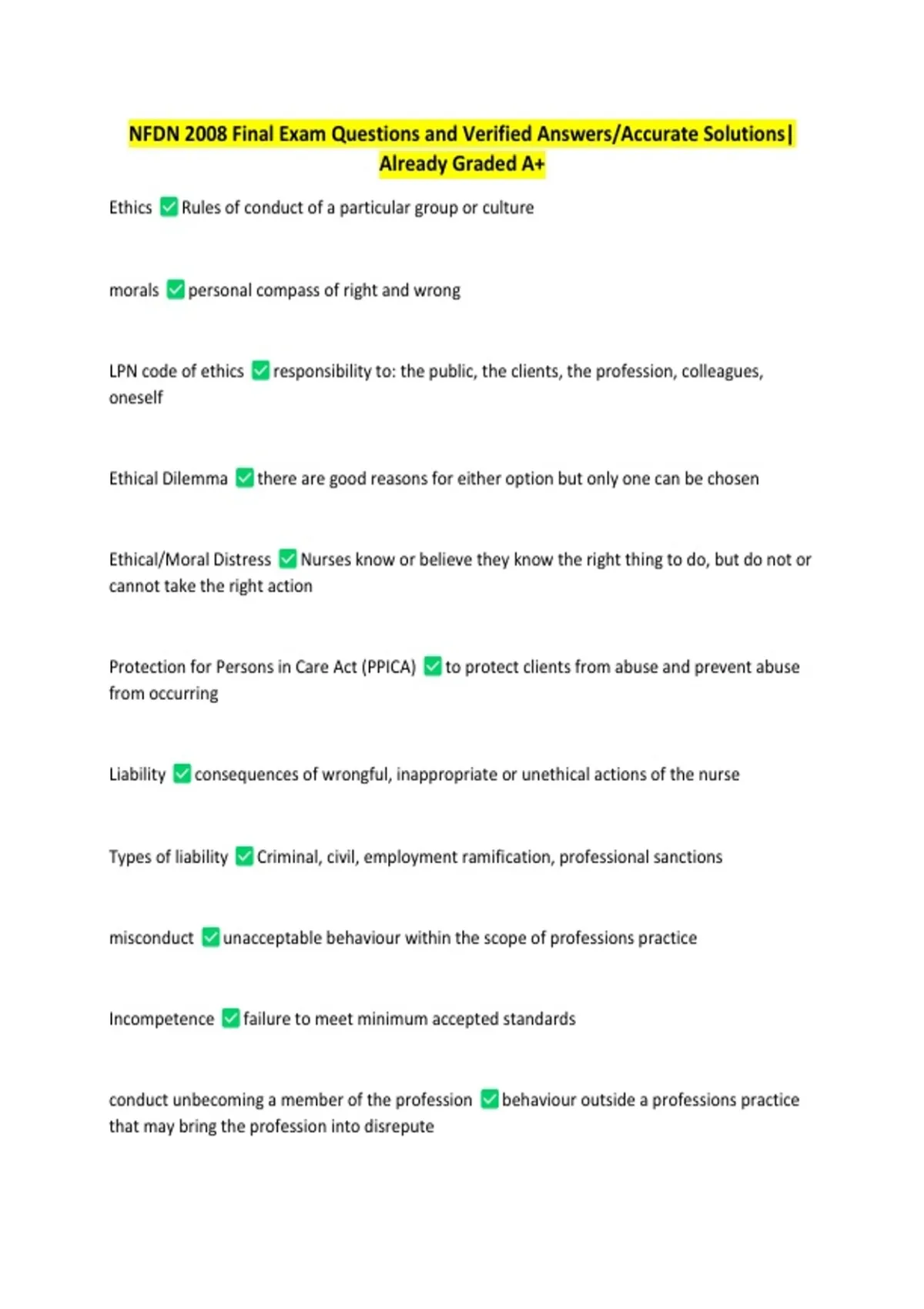 NFDN 2008 Final Exam Questions and Verified Answers/Accurate Solutions|