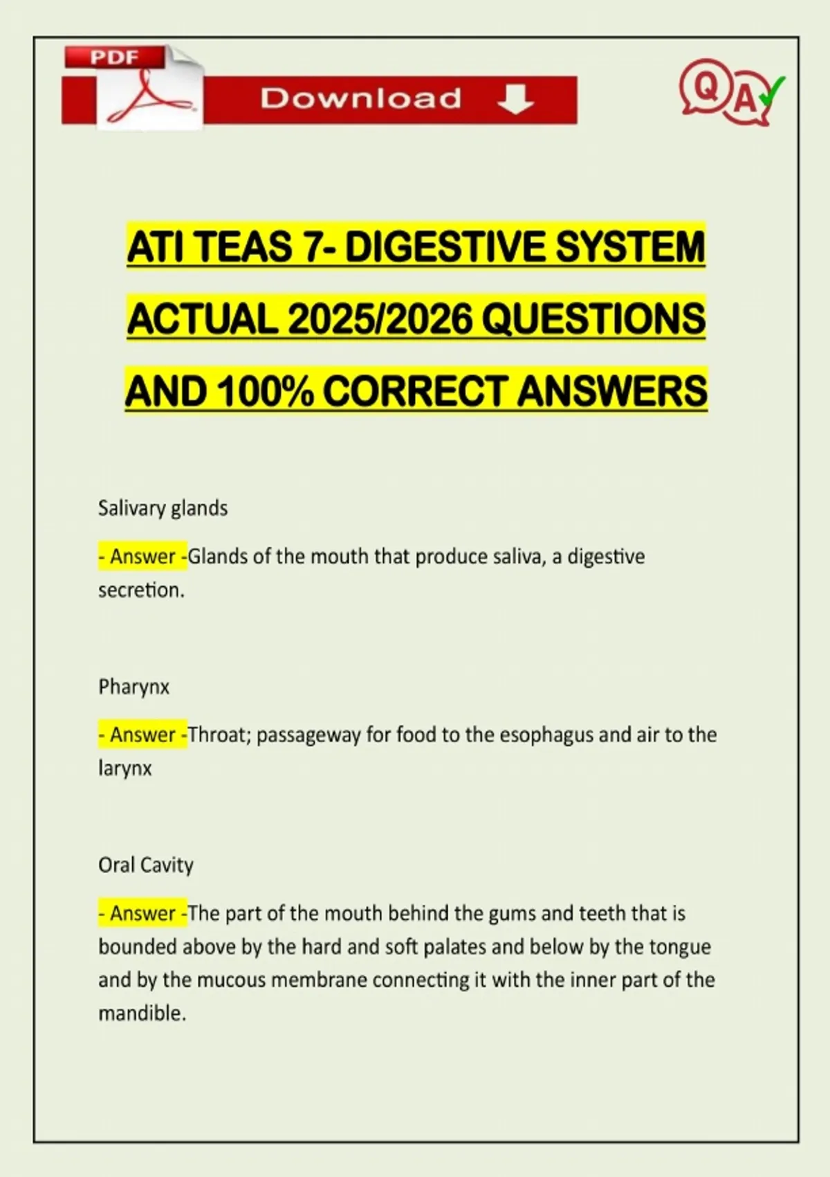 ATI TEAS 7- DIGESTIVE SYSTEM ACTUAL 2025/2026 QUESTIONS AND 100% CORRECT ANSWERS Salivary glands - Answer -Glands of the mouth that produce saliva, a digestive secretion. Pharynx - Answer -Throat; passageway for food to the esophagus and air to the larynx Oral Cavity - Answer -The part of the mouth behind the gums and teeth that is bounded above by the hard and soft palates and below by the tongue and by the mucous membrane connecting it with the inner part of the mandible.