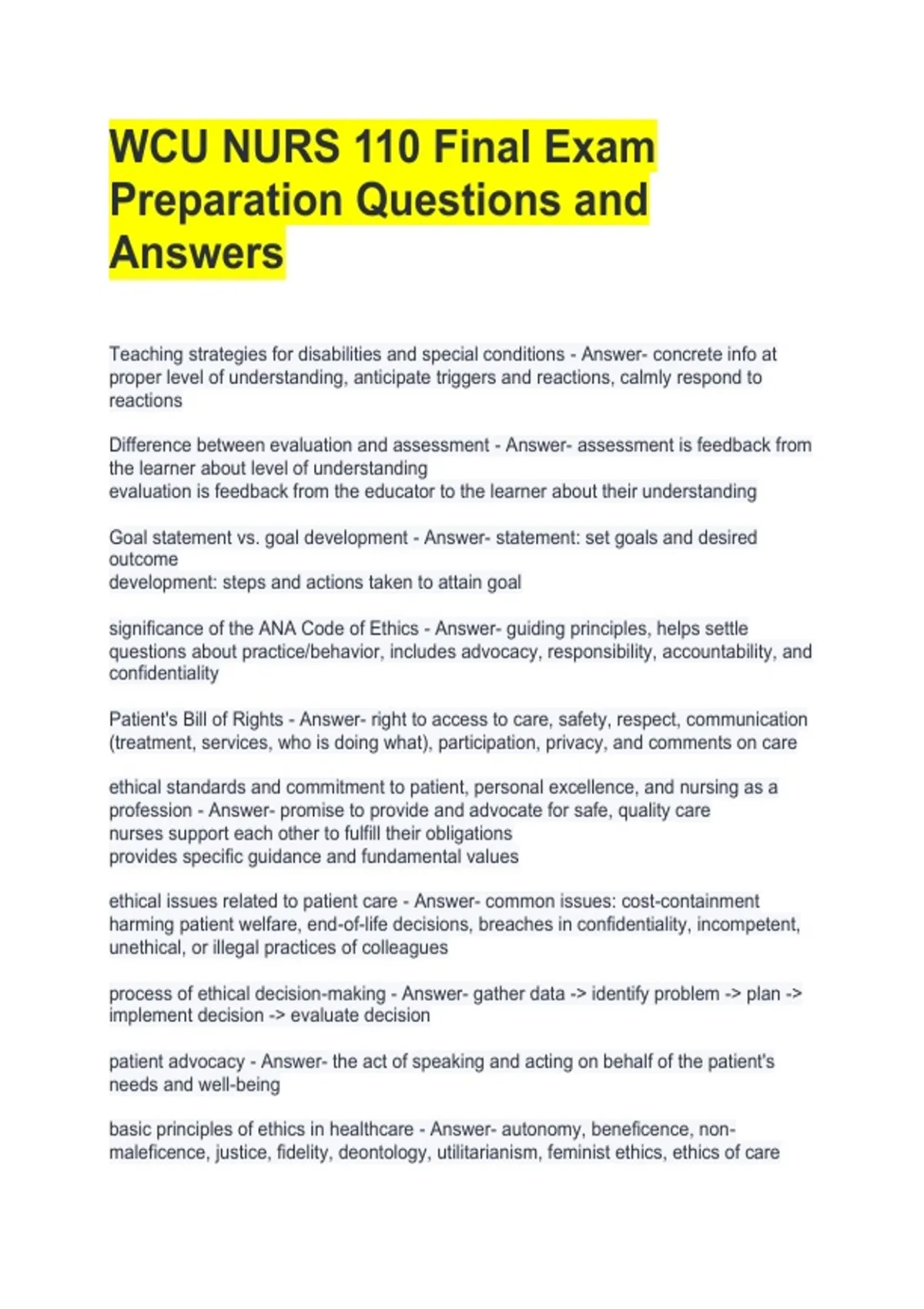 WCU NURS 110 Final Exam Preparation Questions and Answers