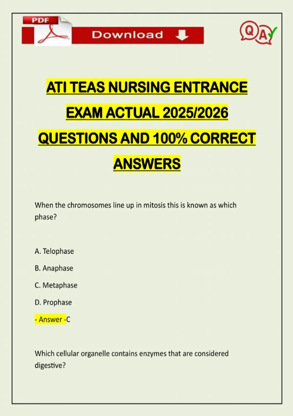 ATI TEAS NURSING ENTRANCE EXAM ACTUAL 2025/2026 QUESTIONS AND 100% CORRECT ANSWERS When the chromosomes line up in mitosis this is known as which phase? A. Telophase B. Anaphase C. Metaphase D. Prophase - Answer -C Which cellular organelle co