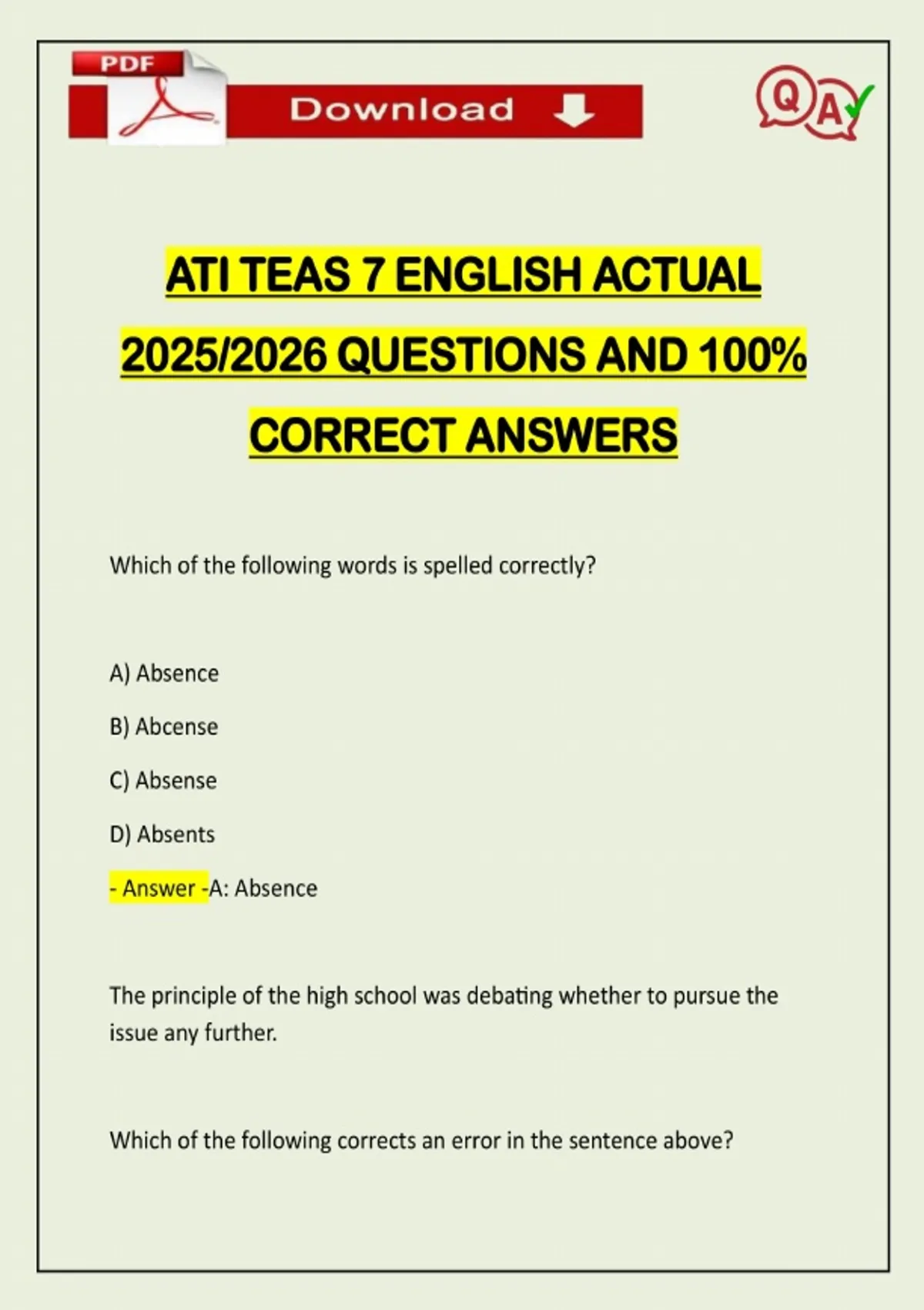 ATI TEAS 7 ENGLISH ACTUAL 2025/2026 QUESTIONS AND 100% CORRECT ANSWERS Which of the following words is spelled correctly? A) Absence B) Abcense C) Absense D) Absents - Answer -A: Absence The principle of the high school was debating whether to pursue the issue any further. Which of the following corrects a